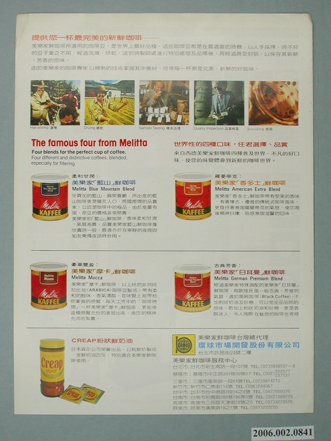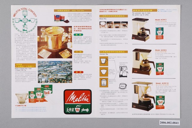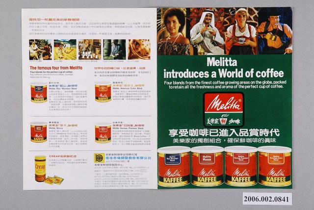 1.本物件為美樂家鮮咖啡廣告單,本物件是紙本彩色廣告單,廣告單為對摺頁形式。廣告單封面標題有文字「MeLitta introduces a World of coffee」、「享受咖啡已進入品嘗時代」,中文小標題「美樂家的獨創組合,確保先咖啡的真味」。圖像方面,最上方有四個人,分別穿著代表其國家的服裝,都在飲用咖啡,表現出此咖啡深受世界上不同國家的喜愛,最下方是四罐咖啡商品的圖示,貼有不同顏色的標籤,表示有各種口味;廣告內文為搭配沖泡咖啡的周邊組合介紹文,包含濾紙、咖啡機、沖泡方式介紹等等;廣告單封底是說明該咖啡商品的製造來源以及此咖啡商品的種類。