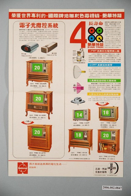 1.本物件為國際牌電子光魔控彩色電視機廣告單,紙製材質。廣告單主視覺為該電視機產品,產品主要特色為紅外線遙控器,廣告單內容為電視機產品特色、型號與規格之介紹。