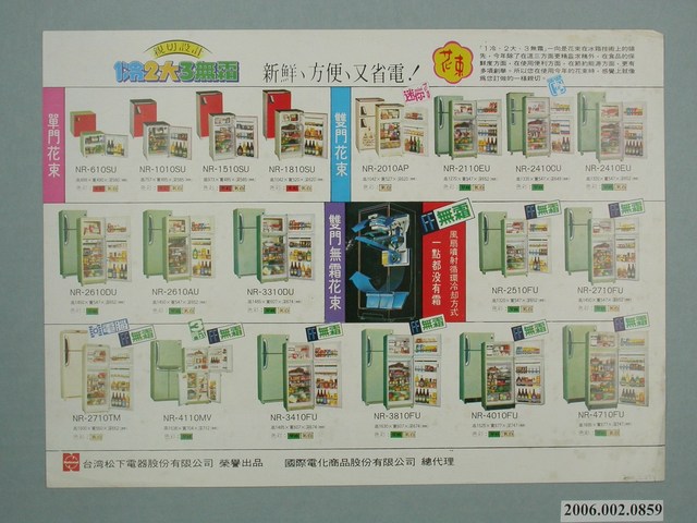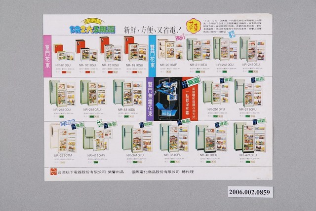 1.本物件為國際牌全自動電冰箱廣告單,紙製材質。廣告單主視覺為新鮮番茄與該系列電冰箱產品,廣告單內容為產品特色、型號與規格之介紹。