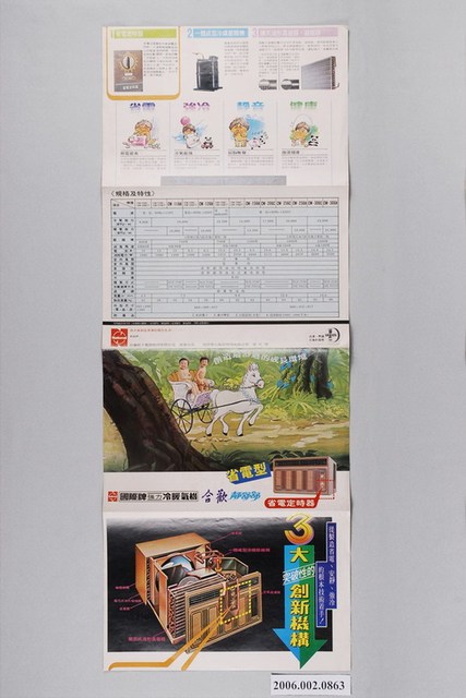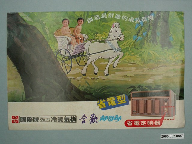 1.本物件為國際牌強力冷暖氣機合歡靜舒舒字樣廣告傳單,傳單為雙面彩色列印,面摺起來的封面有一輛手繪馬車圖樣,馬車上有兩名小孩,旁邊有「創造最舒適的成長環境」字樣,另一面介紹超省電型系列冷氣,及省電高效率型系列冷氣。