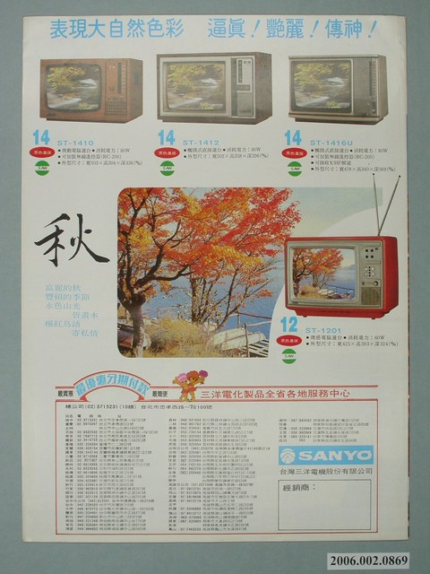 1.本物件為三洋電視機廣告單,紙製材質。廣告單主視覺為三洋公司電視機產品,背景圖為楓葉。廣告單背面為各式電視機種類、型號及全省各地服務中心地址、電話之介紹。