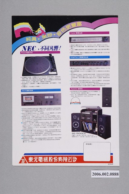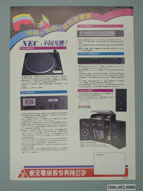 1.本物件為東元NEC音響組合聲帝字樣廣告傳單,封面有法國號的圖樣,背面介紹音響的唱盤系統及錄音系統等,並有「純真.美妙.音色更豐富」宣傳標語