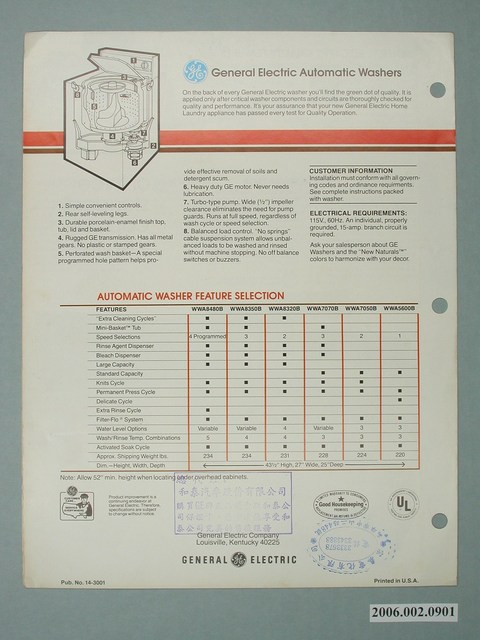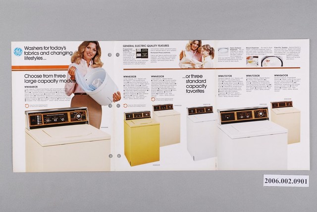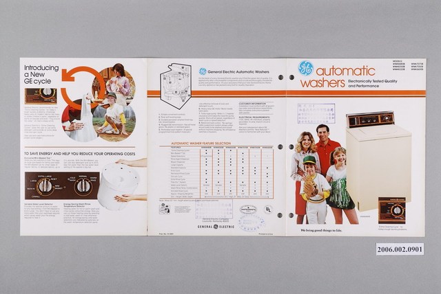 1.本物件為通用電器洗衣機廣告傳單,為雙面彩色列印三折頁,摺起來的封面有一台洗衣機的圖樣,旁邊站著兩男兩女,其中一男一女為成年人,在成年男子的上方,蓋著「總代理:和泰汽車股份有限公司」的印章。