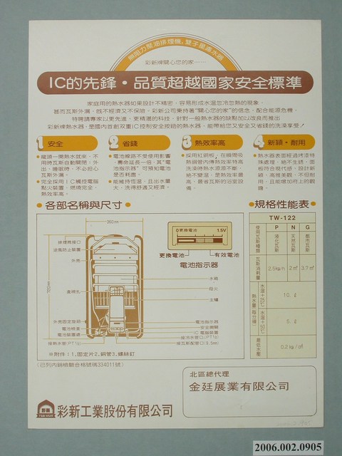 本物件為彩新牌熱水器廣告單,本物件是紙本彩色廣告單,正面中間文字「全壘打」、「安全裝置‧安全過關」,文字下方是該熱水器的商品實體圖。出品者標示於圖樣下方,為「彩新牌熱水器」。廣告單背面是該商品的介紹文,主打「安全、省錢、熱效率高、新穎耐用」,以圖文方式介紹該熱水器的構造與列出規格性能表。廠商名稱是彩新工業股份有限公司,北區總代理為金廷展業有限公司。