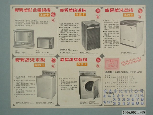 1.本物件為和泰汽車奇異牌電化製品廣告單,本物件是紙本彩色廣告單,正面文字有「和泰HO-TAI和泰汽車」,以橘色為底色,在方型底色上以紅色、白色字體寫上文字,商品品牌「奇異牌電化製品」;廣告單背面有奇異牌的各種商品型錄,有「奇異牌彩色電視機」、「奇異牌除濕機」、「奇異牌洗盤機」、「奇異牌洗衣機」、「奇異牌烘乾機」,總經銷是和泰汽車股份有限公司,展示部有在臺北、臺中與高雄,該廣告單的販售者是位於高雄市青年一路257號的宗泰電化有限公司。