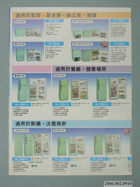 1.本物件為國際牌全自動電冰箱花束字樣廣告傳單,傳單為雙面彩色列印,封面為廚房的圖樣,有一台綠色的冰箱,上方有「花束幸福七彩、處處為您著想」字樣,背面介紹適用於辦公室、套房、餐廳等的冰箱機型。
