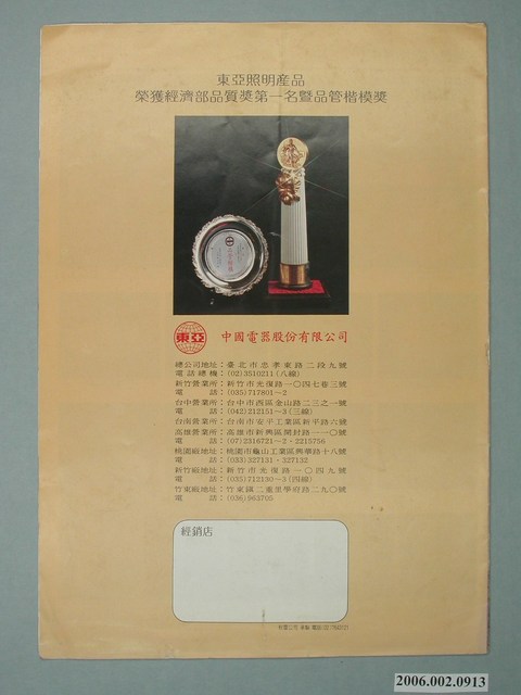 1.本物件為東亞家庭照明指南書冊廣告單,為雙面彩色列印廣告單,封面有一個內有燈泡的黃色燈罩圖樣,下方還擺了一張鋪著桌巾的桌子,封底有獎牌的圖樣及「東亞照明產品榮獲經濟部品質獎第一名暨品管楷模獎」字樣,內頁則介紹各式電燈。