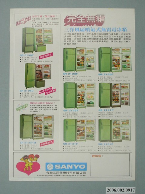 1.本物件為三洋電冰箱廣告單,紙製材質。廣告單主視覺為三洋公司電冰箱產品。廣告單內容為產品特色及各式型號電冰箱之介紹。