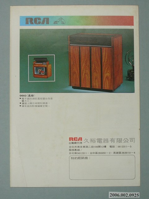 1.本物件為久裕電器有限公司彩色電視機廣告傳單,封面有藍色「RCA」字樣,封底有「980 遙控」字樣及圖片,內頁則介紹多種彩色電視機機型。