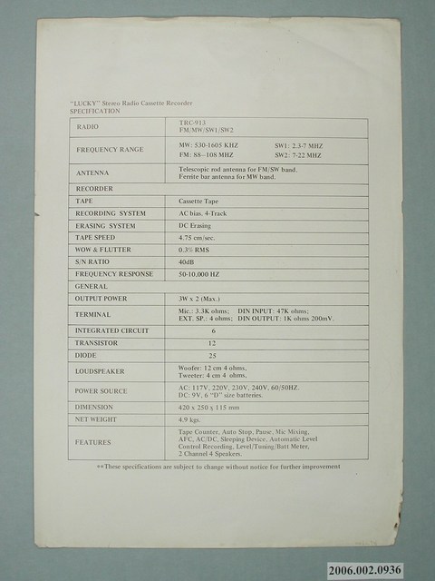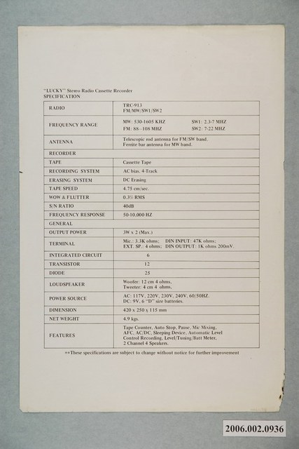 本物件為幸福牌錄音機廣告單,本物件是紙本彩色廣告單,正面文字「LUCKY幸福牌Stepeo Radio Cassette Recorder」,為幸福牌的錄音機商品廣告單,廣告圖像是以商品實體圖,右下方有英文介紹文字,商品的後方有外國人物照,使消費者明確了解該商品的外觀;廣告單背面是該商品的規格,皆以英文作為介紹文字,內容含該錄音機的型號、規格等。