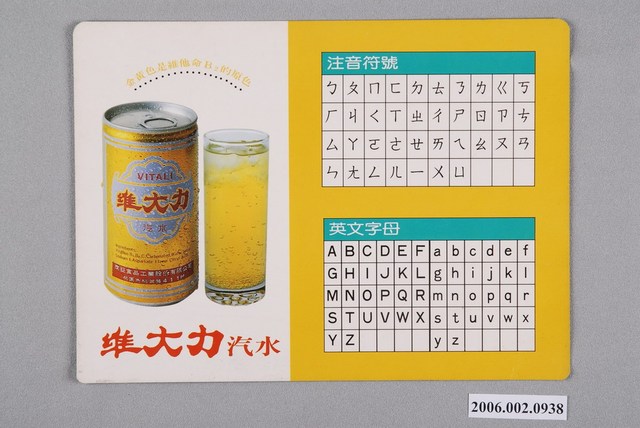 1.本物件為維大力汽水廣告單,本物件是紙本彩色廣告單,為飲料廣告,正面右上方以紅色文字「維大力汽水」,左上方為維大力汽水實體圖,正中間有藝人俞小凡照片以及其簽名,其一手拿著維大力汽水、一手拿著籃球,作為廣告代言人,俞小凡當時為華視掌聲響起女主角;廣告單背面的左方是維大力汽水實體圖,右方有注音符號表與英文字母表。