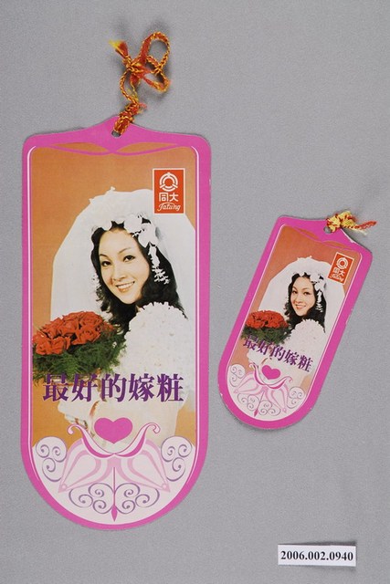 1.本物件為大同公司廣告單,有大小兩件式,紙製材質。廣告單上方有一圓孔,繫以一紅黃相間的繩子。廣告單主視覺為一穿著白紗、手持捧花的年輕女性。廣告單中央有一標題「最好的嫁妝」;右上方有大同公司商標。