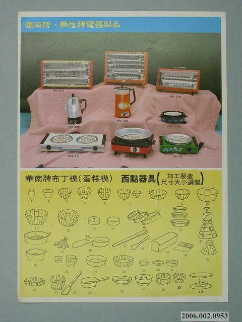 本物件為華南牌華信牌產品廣告單,紙本彩色,正面標題「華南牌 華信牌 產品系列」,文字下方有商品圖:鍋子、電風扇、電暖器,為華南鋁業有限公司、劦昶企業有限公司出品,華南廠地址為臺南市裕農路668巷79號,劦昶廠地址為臺南市裕農路668巷75弄3號;廣告單的背面上方有華南牌、華信牌的電器製品實體圖,下方是華南牌西點模具、器具圖。