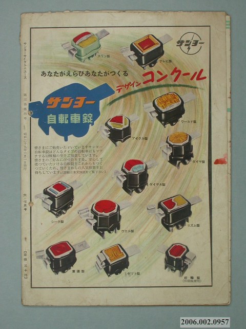 本物件為《三洋自行車新聞》第3卷第4號,封面為サンヨーサイクルニュース(circle news)廣告,2名孩童拿著網子捕捉昆蟲,近景為一臺腳踏車的後輪,內頁可見數款「自轉車錠」,為安全鎖型錄。