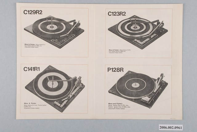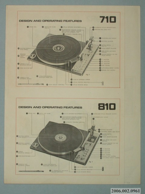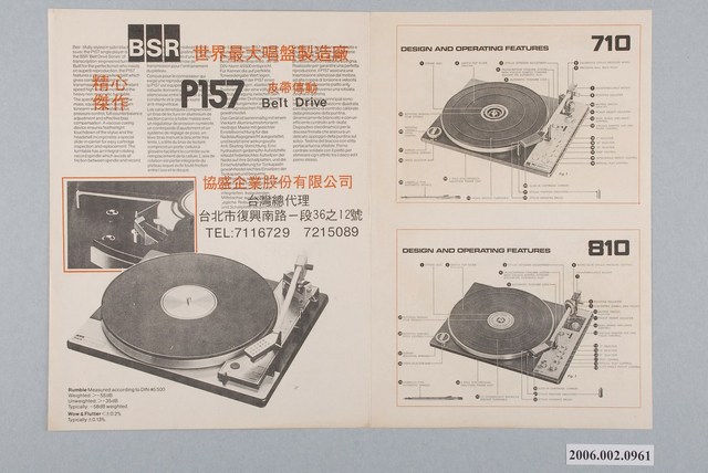 本物件為唱盤廣告單,紙本彩色,對摺頁形式,廣告內容為唱盤廣告。廣告單封面標題「BSR世界最大唱盤製造廠」,廣告圖像是唱盤的實體照,以文字標示該商品構造是由以皮帶使唱盤傳動「Belt Drive」;內頁內容列出四種不同型號的唱盤,以附上照片與英文文字簡單說明;在廣告單封底列出「710」、「810」兩種型號的唱盤,分別介紹其「DESIGN AND OPERATING FEATURES」(設計與功能操作),以英文詳細標示唱盤的各個構造。該廣告單是由臺灣總代理為「協盛企業股份有限公司」出品,其位於臺北市復興南路一段36之12號。