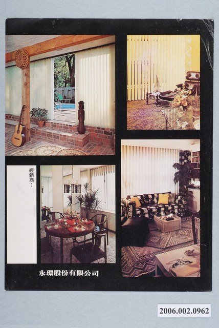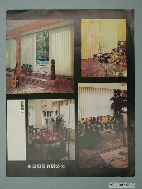 本物件為美而簾直式百葉窗廣告單,紙本彩色。廣告單正面標題為「美而簾 直式百葉窗」,廣告圖像是以室內空間為背景,該室內空間有一片直式百葉窗,此即為該廣告內容的商品物。廣告背面有四個室內實體照,在庭院、客廳、餐廳等,皆有出現直式百葉窗,表達出該商品適合各種室內空間。該廣告單由永環股份有限公司出品。