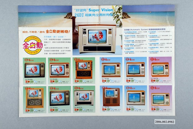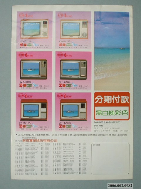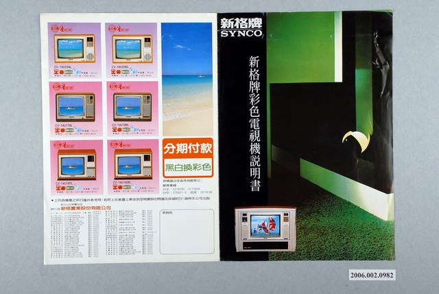 1.本物件為「新格牌彩色電視機說明書」,為彩色廣告說明書,可展開,商品是新格牌彩色電視機。廣告單底色為綠色,左上方文字為「新格牌SYNCO」、下方為題名「新格牌彩色電視機說明書」,左下方則為電視機的產品樣貌。背後與內頁則為電視機的產品介紹與新格實業股份有限公司的基本資料。