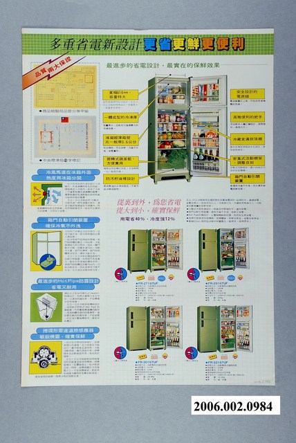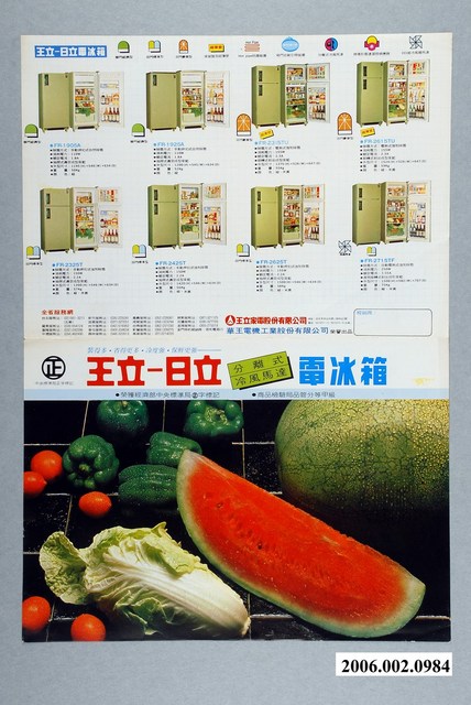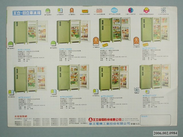 1.本物件為日立電冰箱廣告單,紙製材質。廣告單主視覺為各樣水果背景,廣告單內容為產品特點、型號、規格與服務站之介紹。