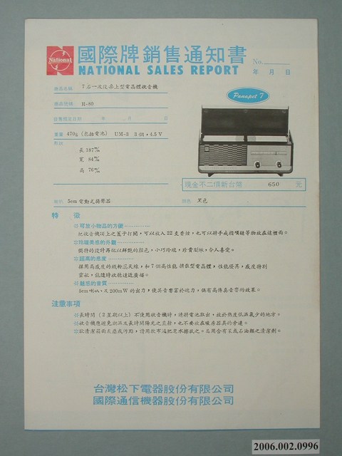 1.本物件為國際牌電晶體收音機廣告單,紙製材質。廣告單主視覺為該收音機產品,廣告單背面為國際牌銷售通知書,介紹產品規格、特色與注意事項。