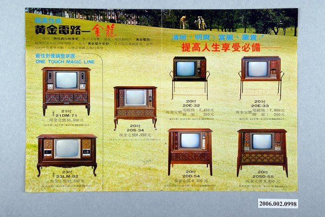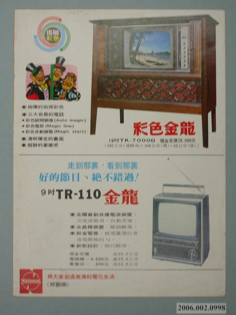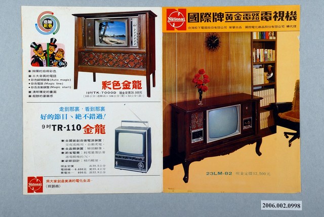 1.本物件為國際牌黃金電路電視機廣告單,紙製材質。廣告單主視覺為該電視機產品,廣告單內容為產品特色、型號之介紹。