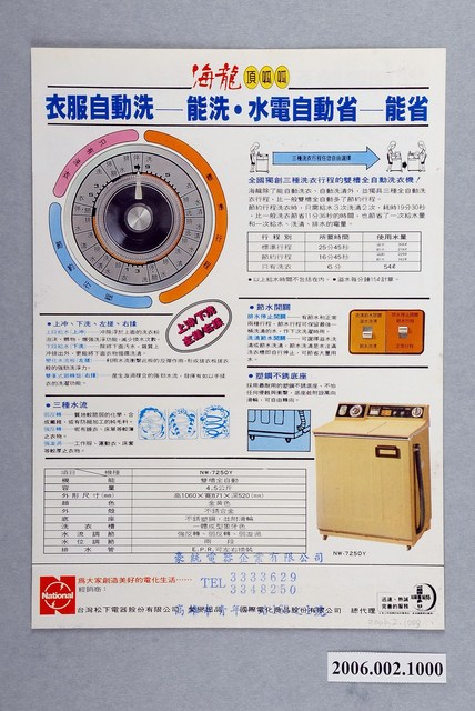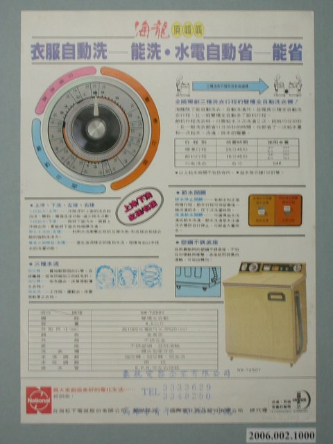 1.本物件為國際牌全能洗衣機廣告單,紙製材質。廣告單主視覺為該洗衣機產品,廣告單背面為產品特色、規格之介紹。
