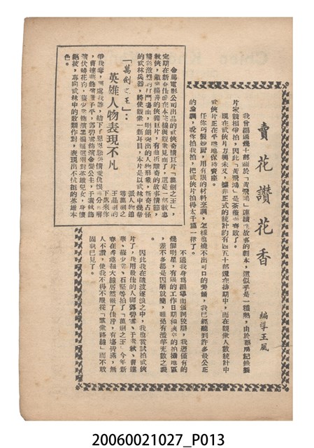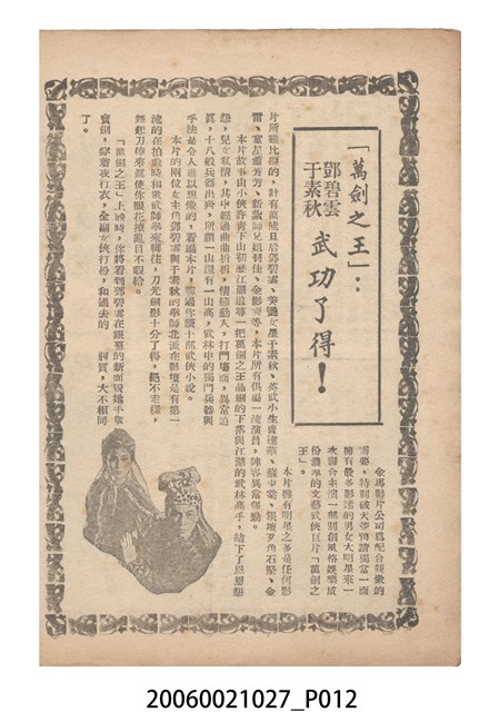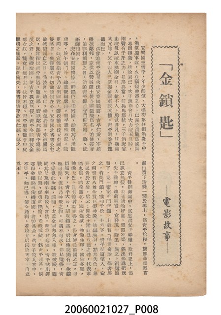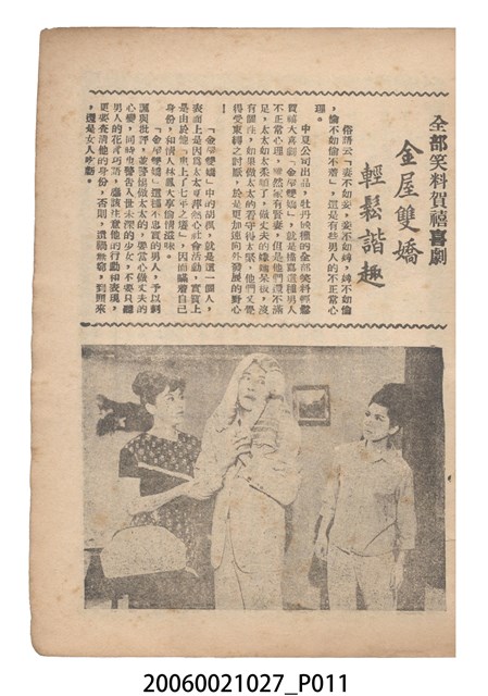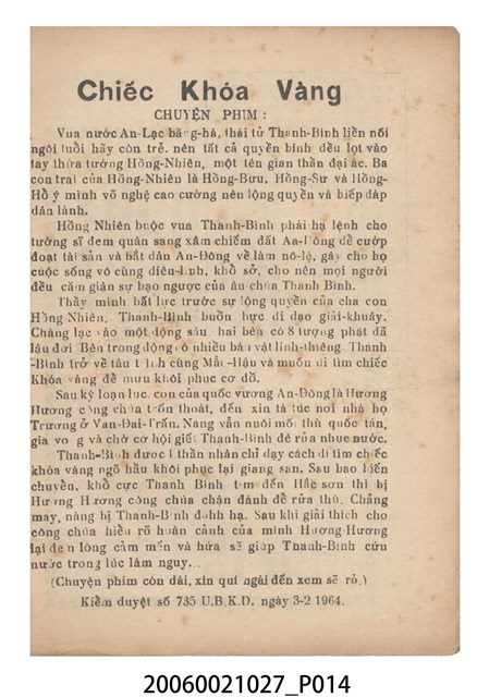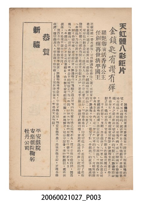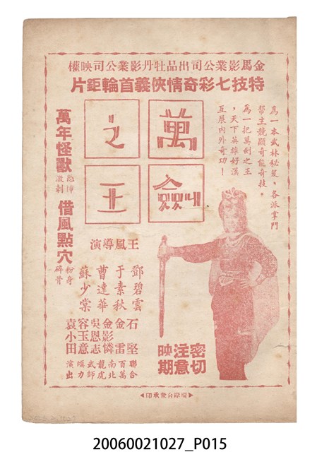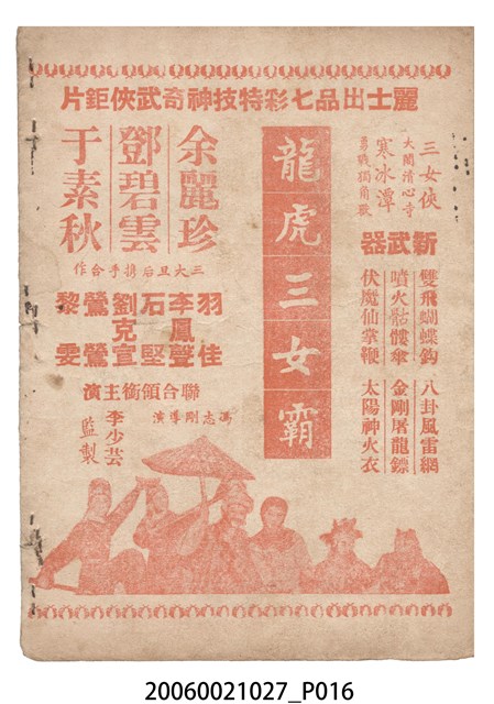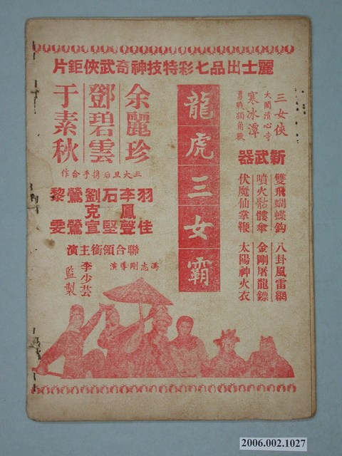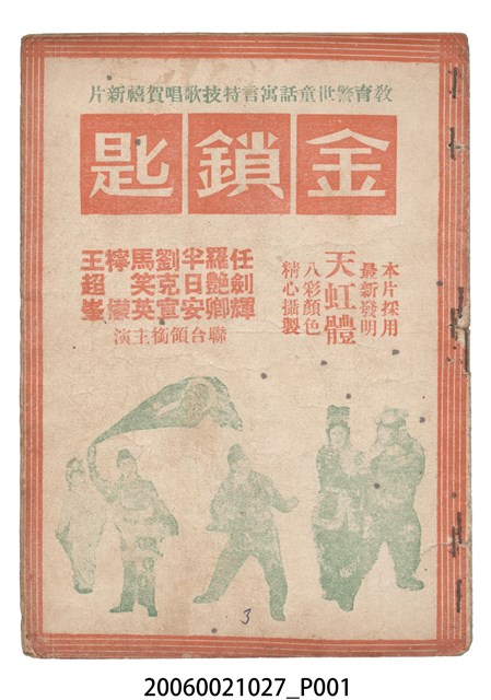 本件保存良好,彩色印刷,為金鎖匙電影本事。由任劍輝、羅艷卿、劉克宣、馬笑英、檸檬、王超峰主演,導演莫康時。背面為電影龍虎三女霸。