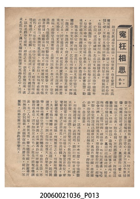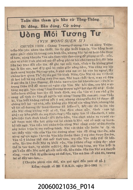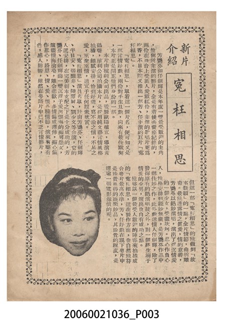 本件保存良好,彩色印刷,為冤枉相思電影本事。由芳艷芬、任劍輝、半日安、任冰兒主演,導演黃鶴聲。背面為電影隱身俠大戰催花賊。