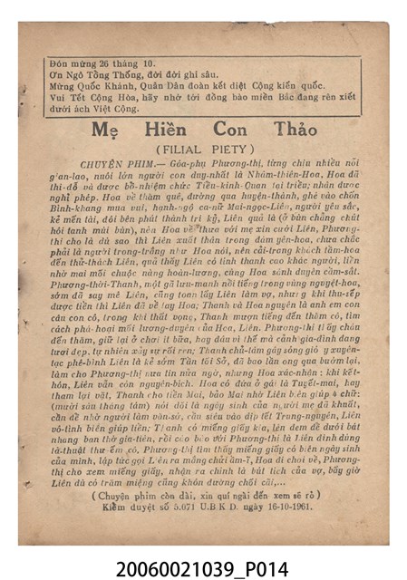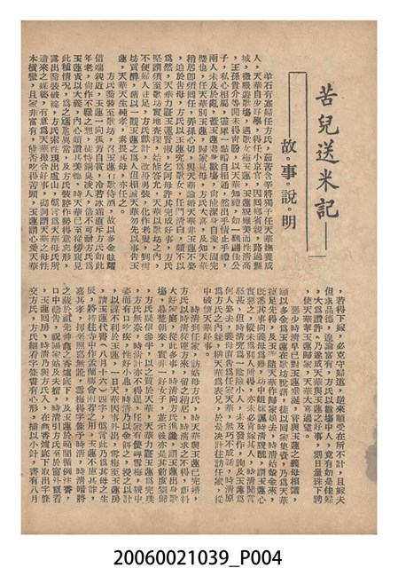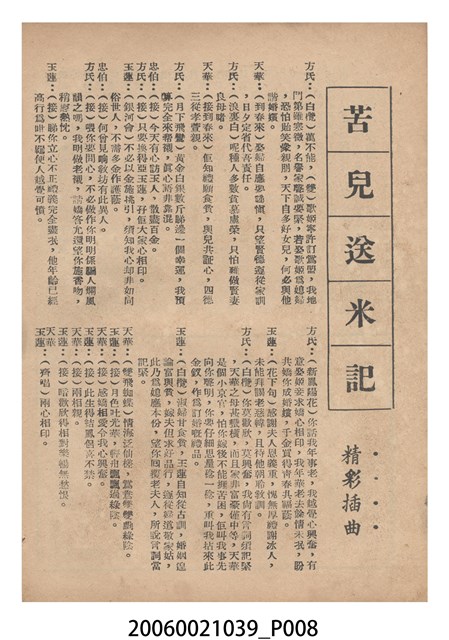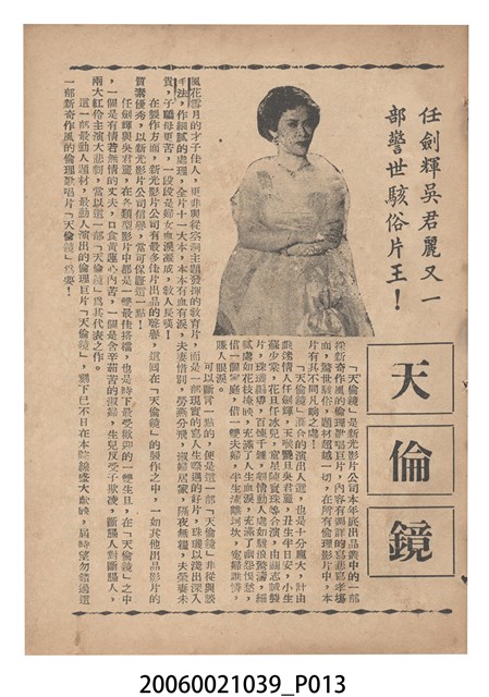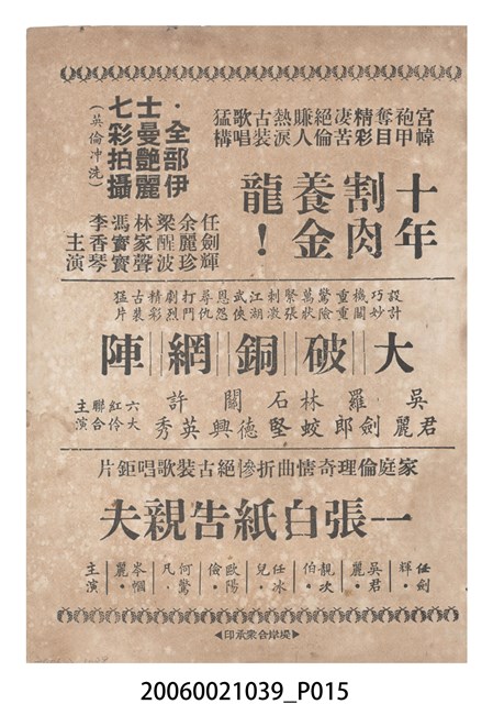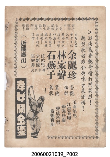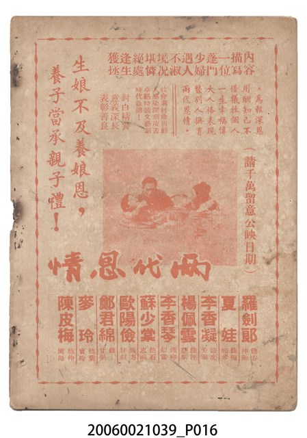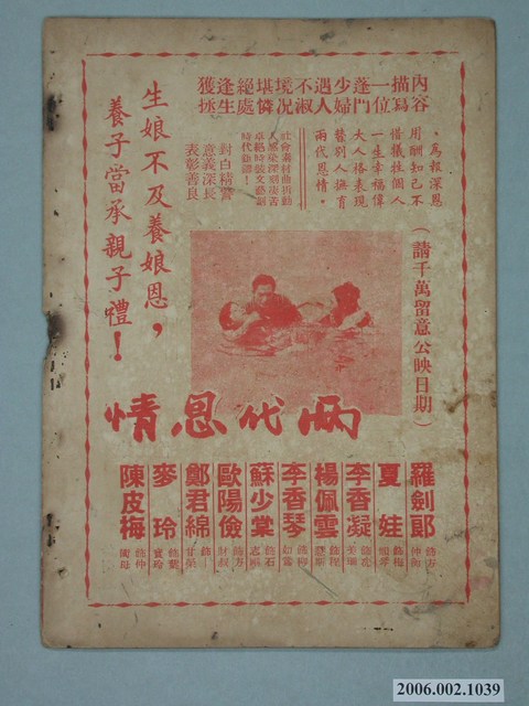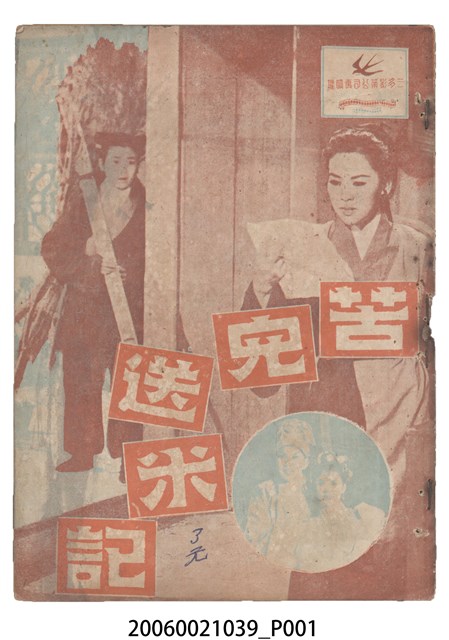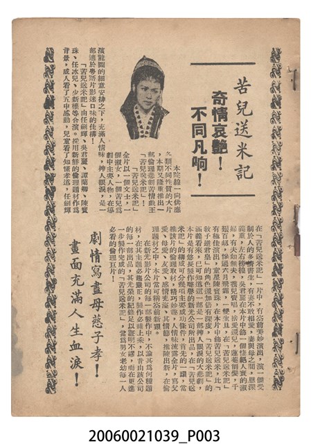 本件保存良好,彩色印刷,為苦兒送米記電影本事。由任劍輝、譚蘭卿、任冰兒、陳寶珠主演,導演龍圖。正面印有三多影業商標,背面電影兩代恩情。