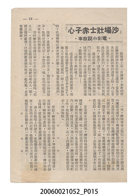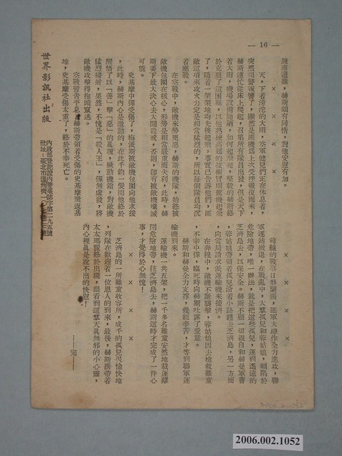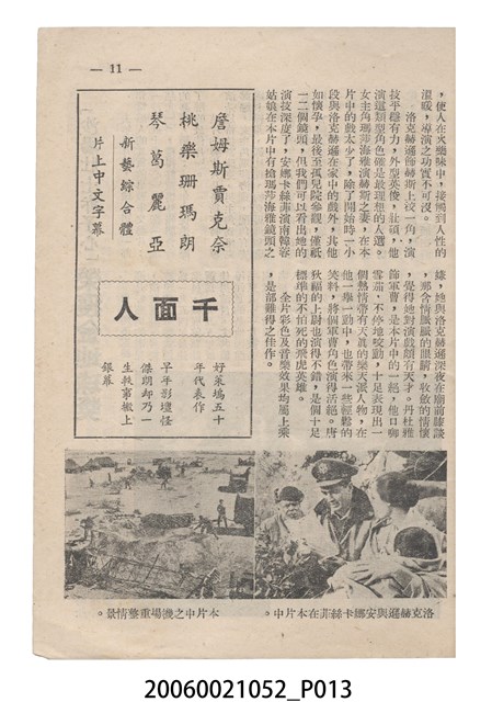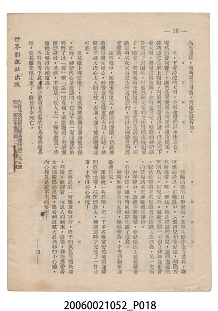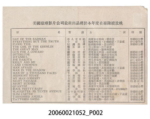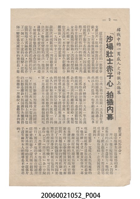 本件保存良好,彩色印刷,為沙場壯士赤子心 Battle Hymn電影本事。由 Rock Hudson、Anna Kashfi主演,導演 Douglas Sirk。背面印有「世界影訊社」字樣。