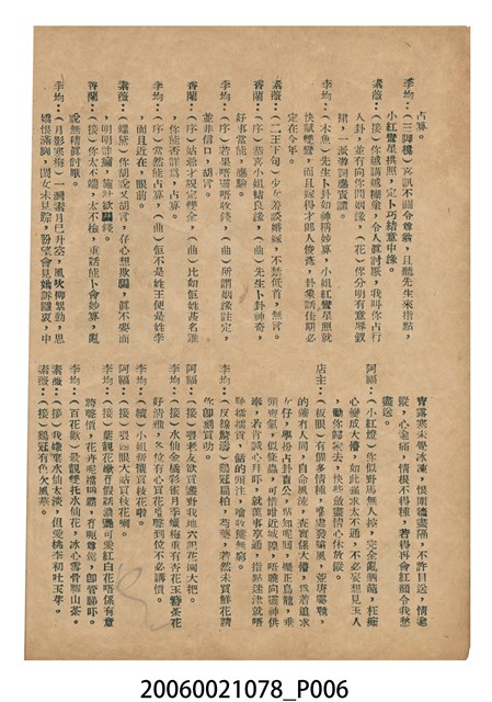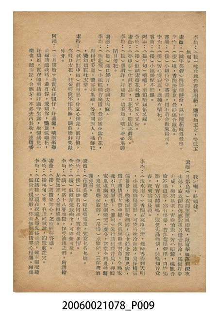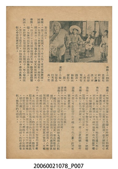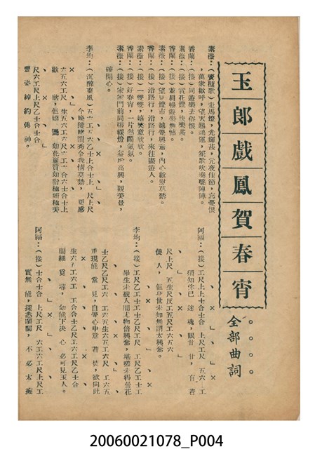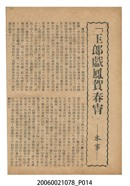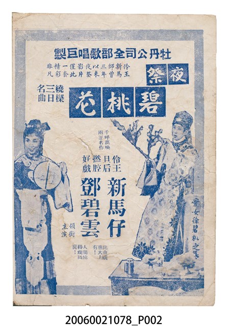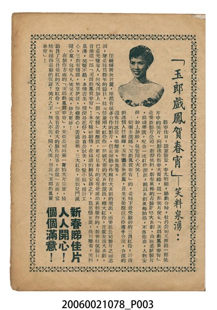 本件保存良好,彩色印刷,為玉郎戲鳳賀春宵電影本事。由任劍輝、吳君麗、張醒非、任冰兒主演,導演珠璣。正面印有牡丹影業公司商標,背面為電影能言鳥。