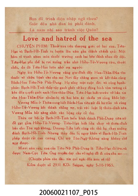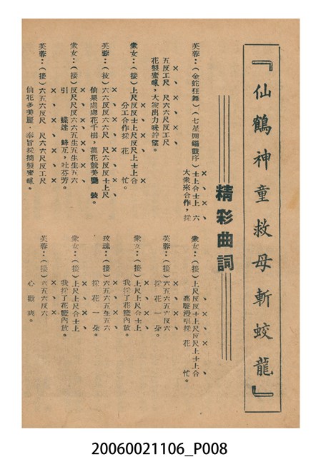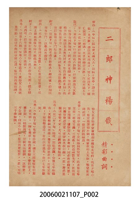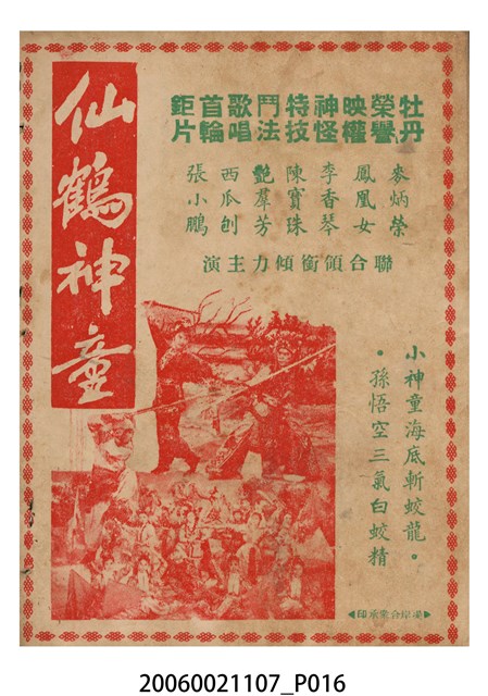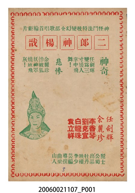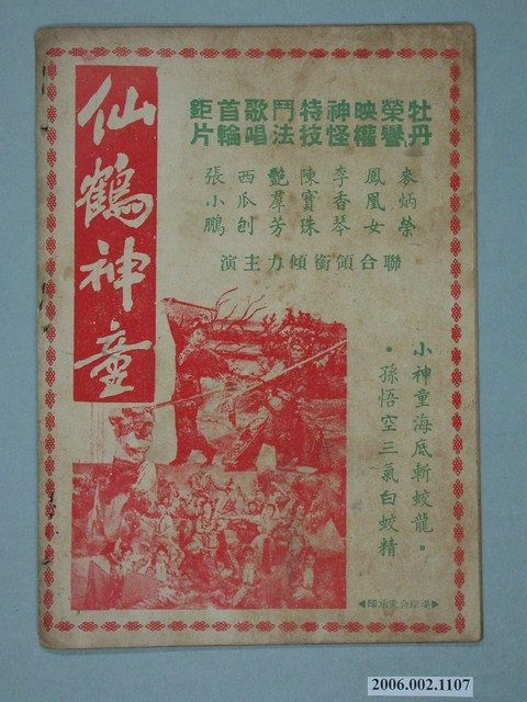 本件保存良好,彩色印刷,為二郎神楊戩電影本事。由任劍輝、余麗珍、李香琴、劉克宣、白龍珠、袁立祥主演,導演黃鶴聲。背面為電影仙鶴神童。