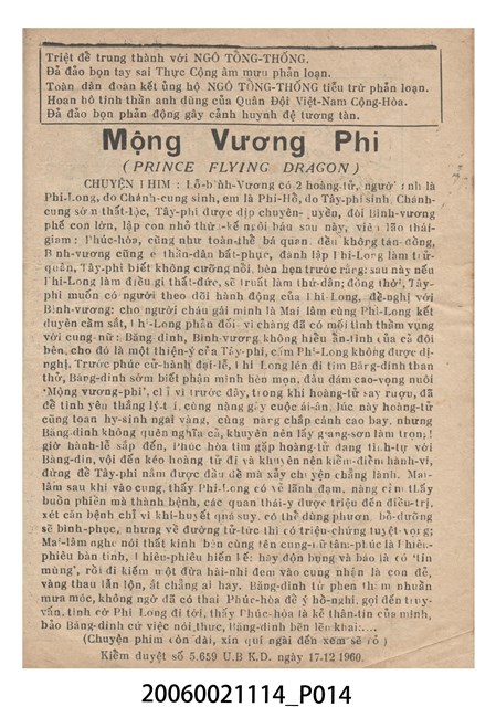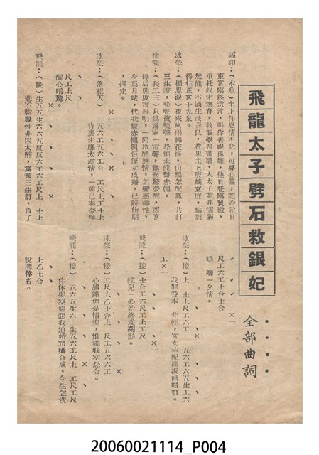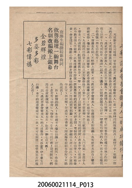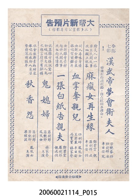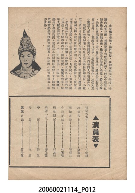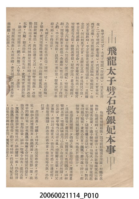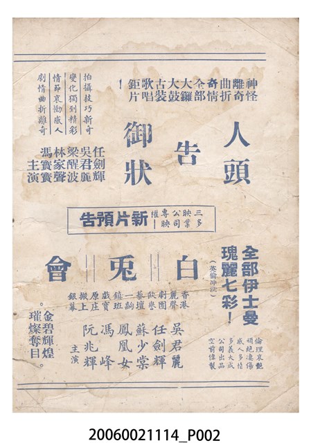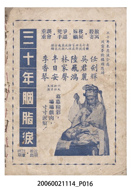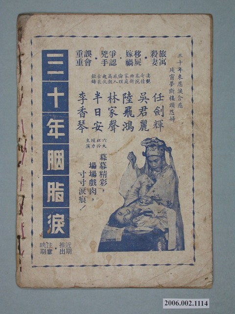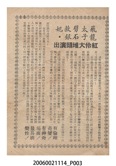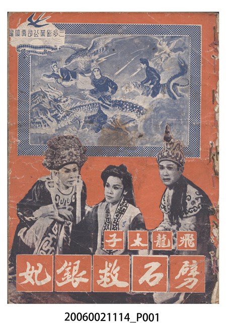 本件保存良好,彩色印刷,為飛龍太子劈石救銀妃電影本事。由任劍輝、余麗珍、梁醒波、林家聲主演,導演黃鶴聲。正面印有三多影業公司商標,背面為電影三十年胭脂淚。