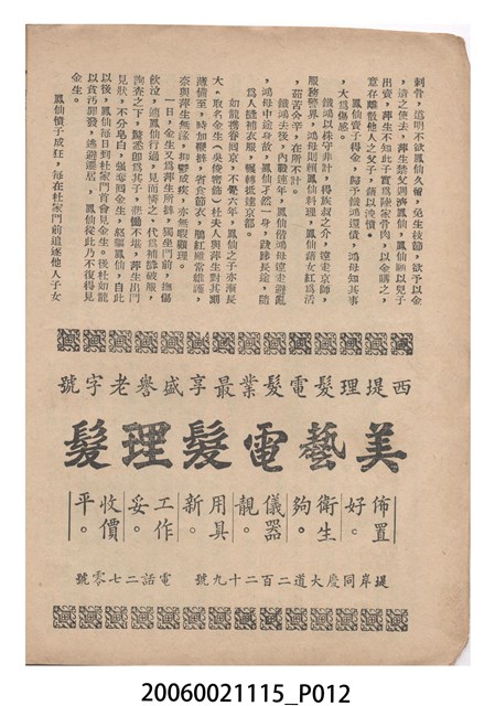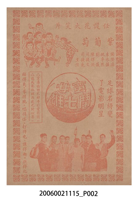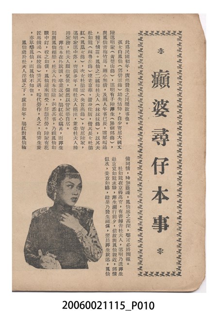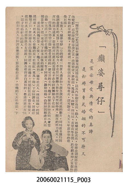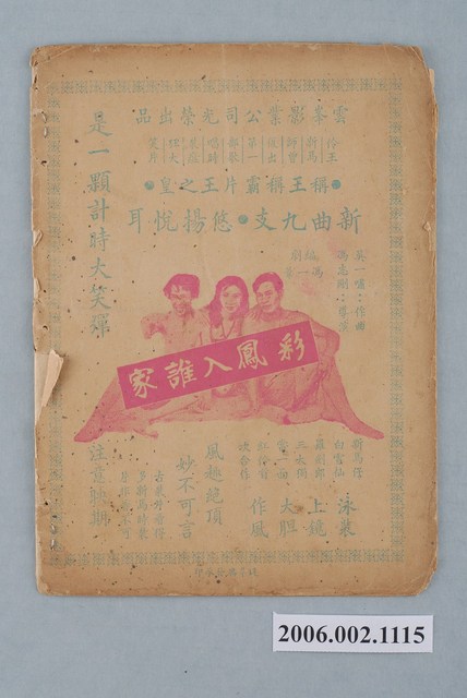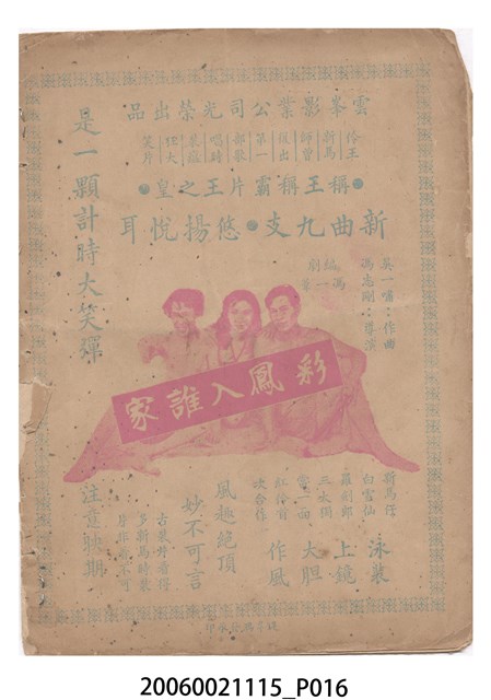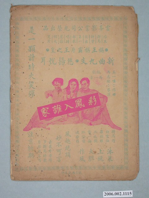 本件保存尚可,彩色印刷,為癲婆尋仔電影本事。由羅劍郎、李鏡清、林魯岳、鳳凰旦主演,導演陳皮。背面為電影彩鳳入誰家。