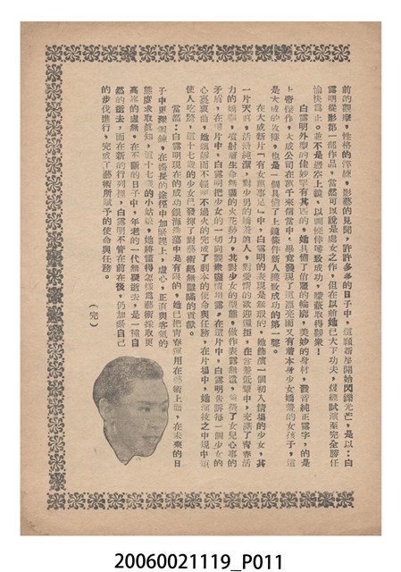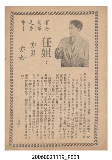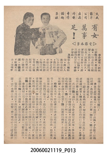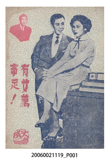 本件保存良好,彩色印刷,為有女萬事足電影本事。電影由任劍輝、白露明主演,導演為蔣偉光。正面印有大成影業商標,背面為電影女主角白露明的照片。