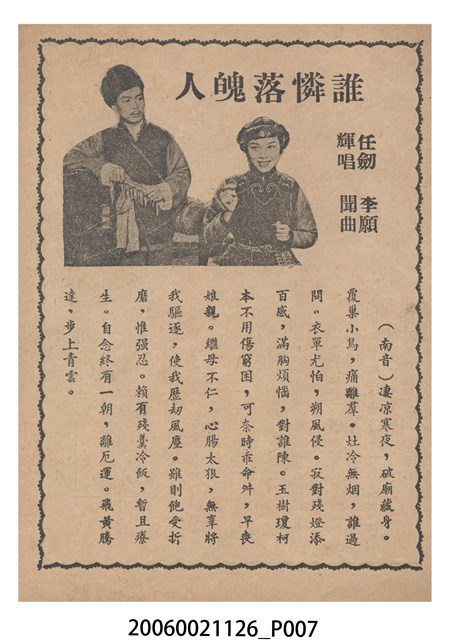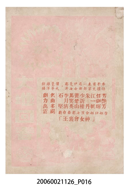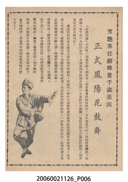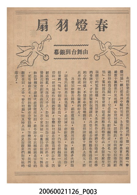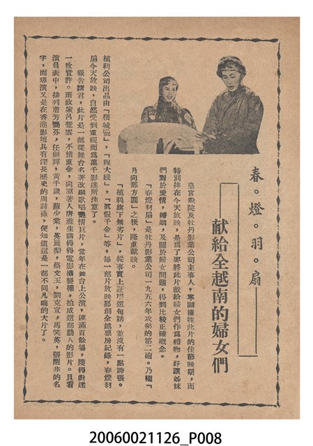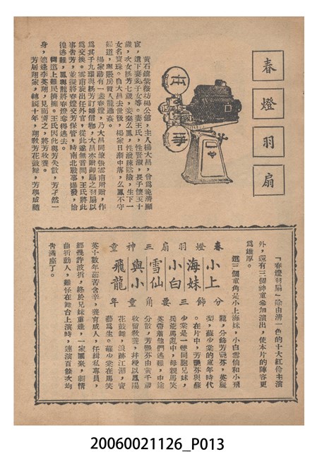 本件保存良好,單色印刷,為春燈羽扇電影本事。由任劍輝、芳艷芬、黃千歲、蘇少棠主演,導演周詩祿。背面為電影神女會襄王。