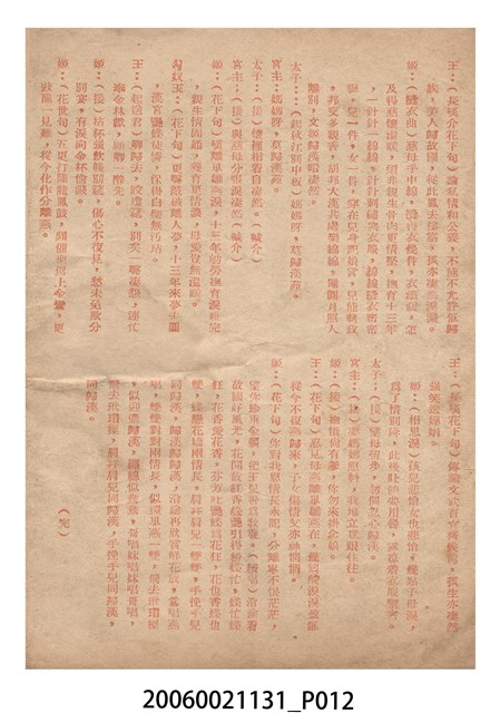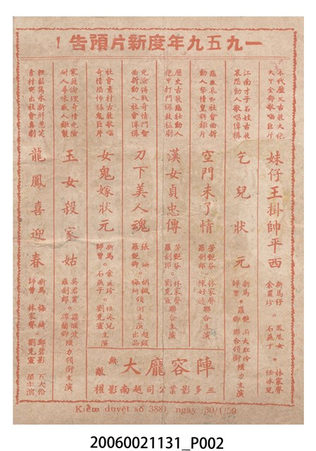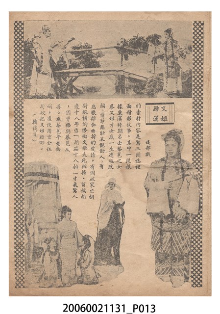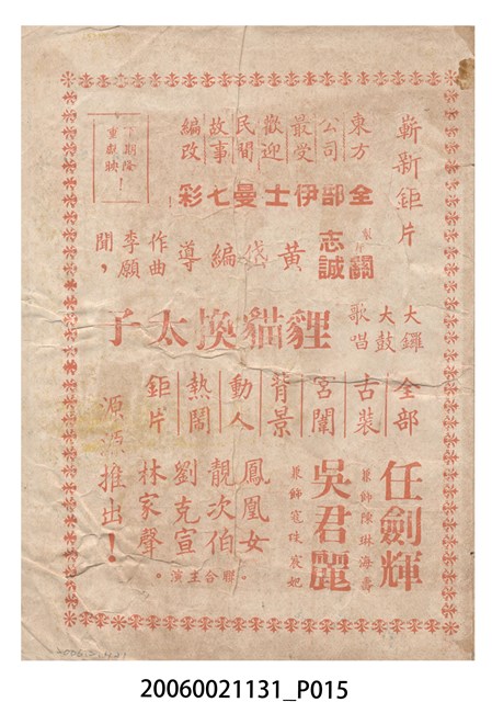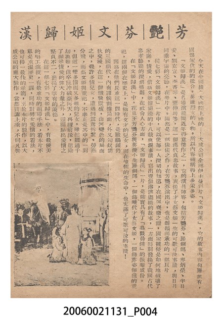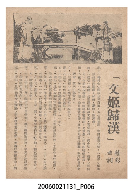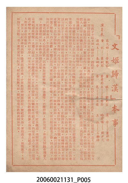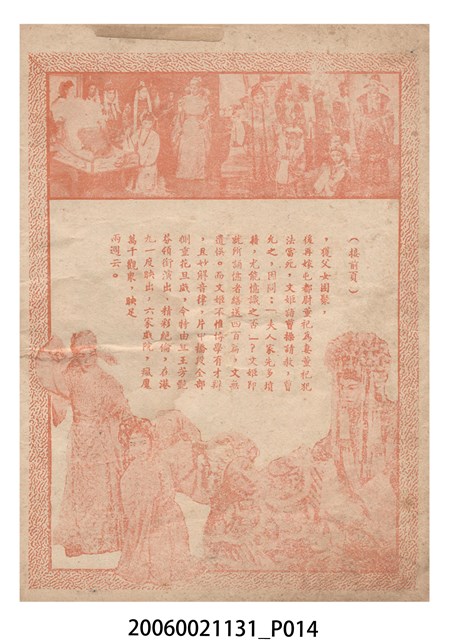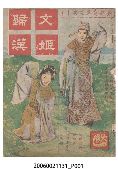 本件保存良好,彩色印刷,為文姬歸漢電影本事。由芳艷芬、羅劍郎、麥炳榮、劉克宣主演,導演龍圖。正面印有大成影業商標。