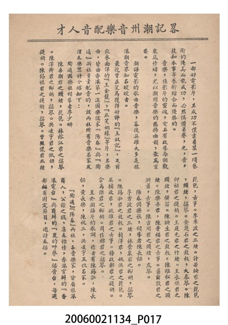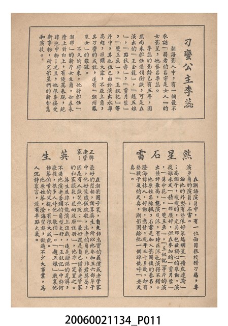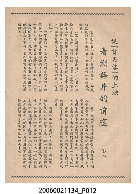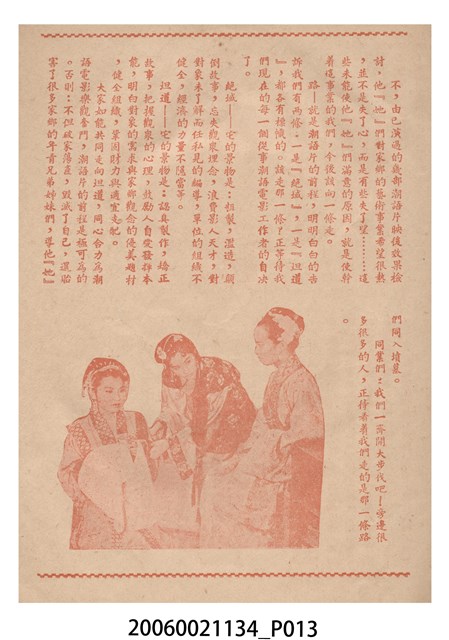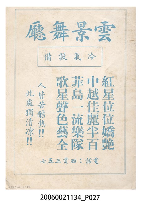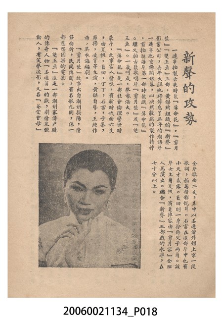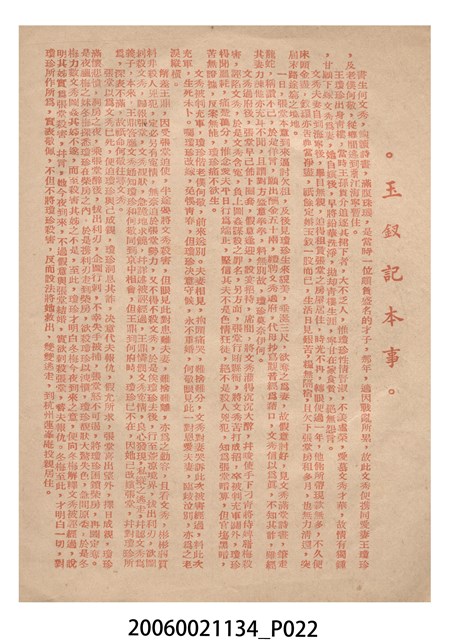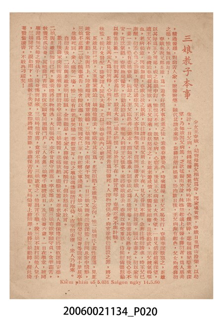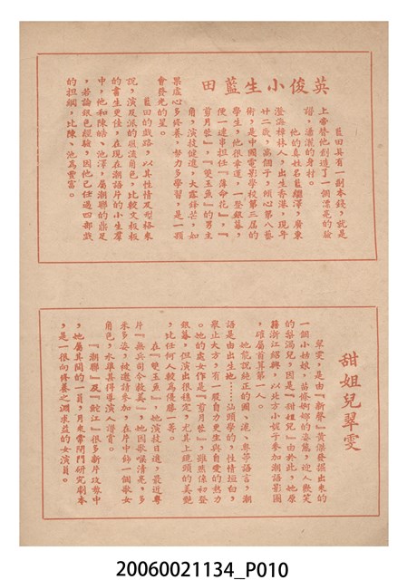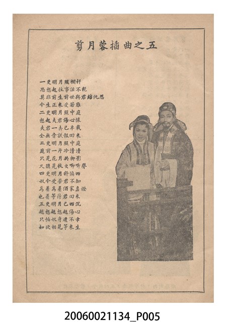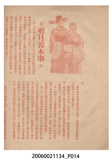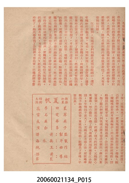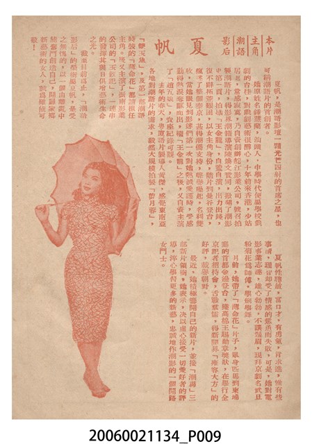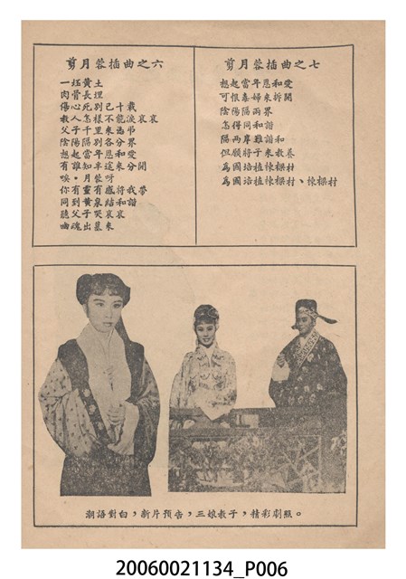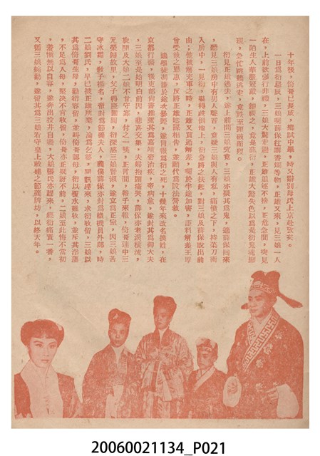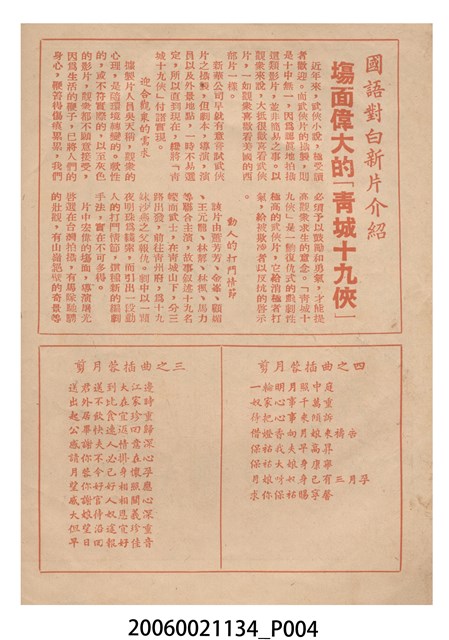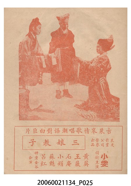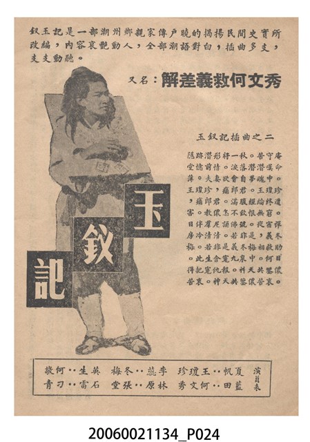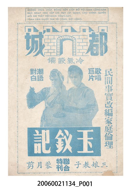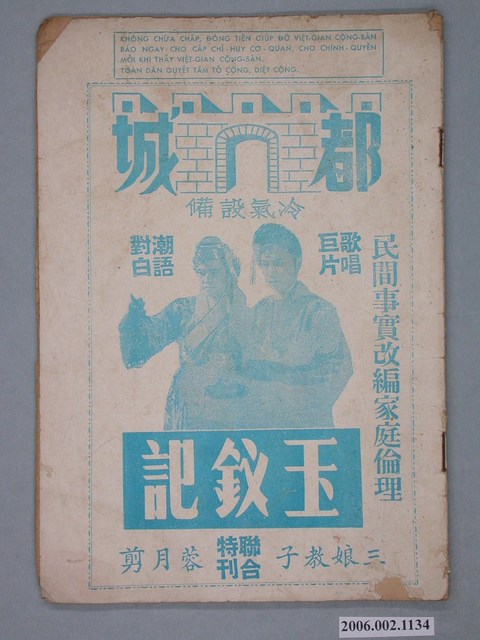 本件保存良好,彩色印刷,為玉釵記電影本事。由夏帆、藍田、李蕊、金鷹主演。正面印有都城戲院商標,背面為遠東行廣告。