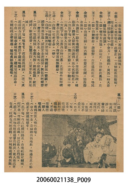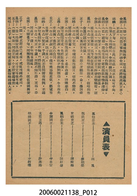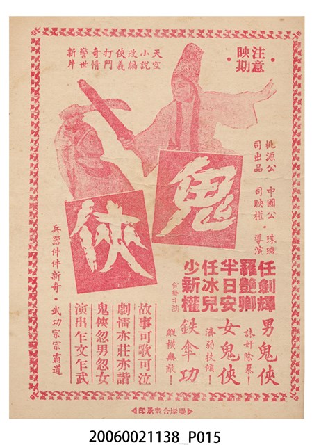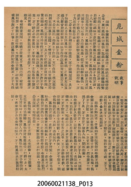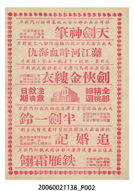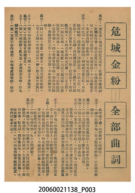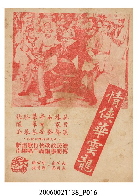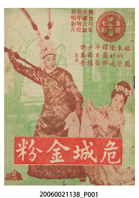 本件保存良好,彩色印刷,為危城金粉電影本事。由林鳳、麥炳榮、陳好逑、譚蘭卿、半日安、少新權、許英秀主演,導演黃鶴聲。正面印有中國影業公司商標,背面為電影情俠華雲龍。