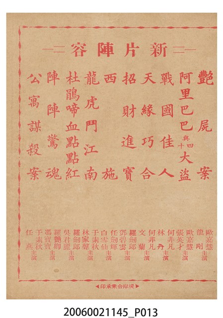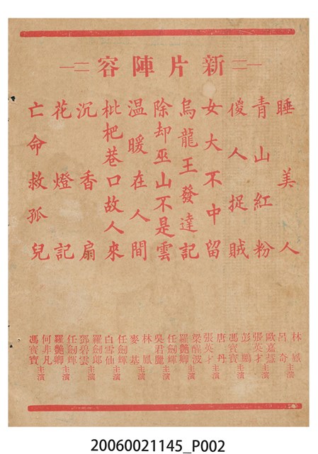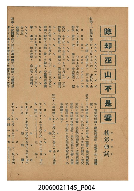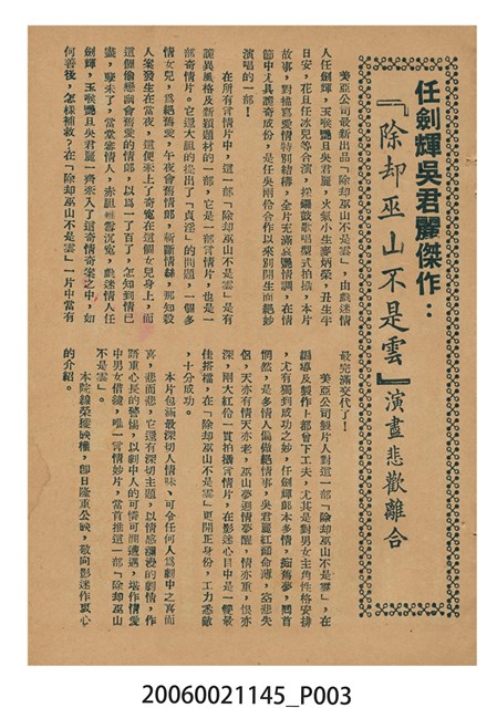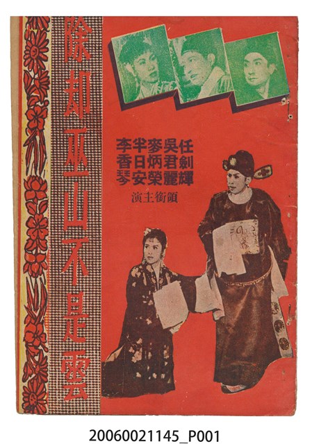 本件保存良好,彩色印刷,為除却巫山不是雲電影本事。由任劍輝、吳君麗、麥炳榮、半日安、李香琴主演,導演珠璣。背面為電影藝海春潮。