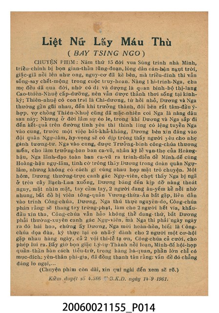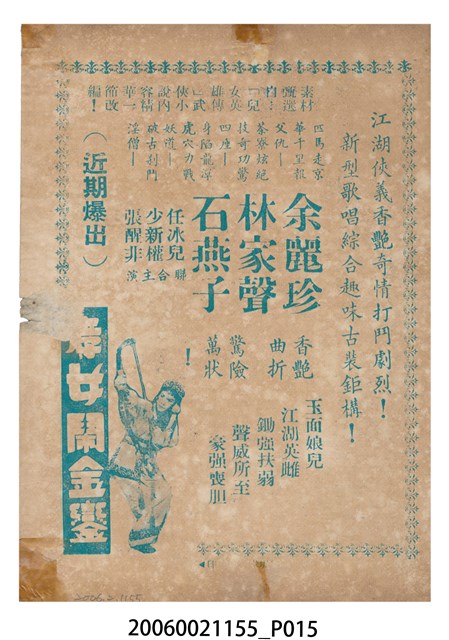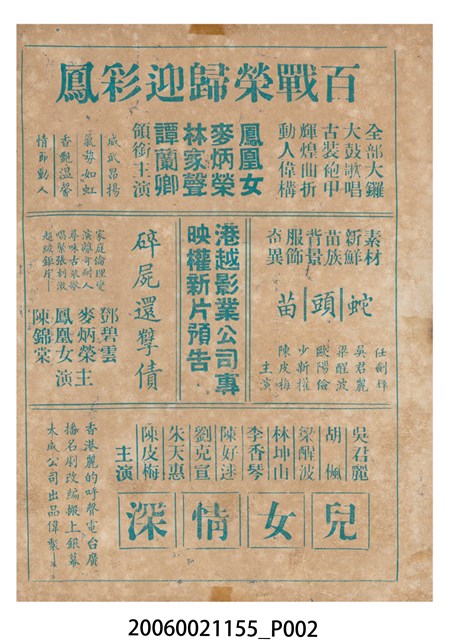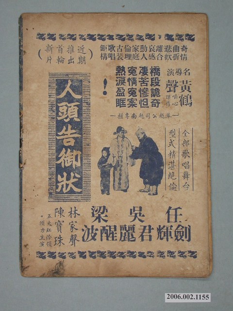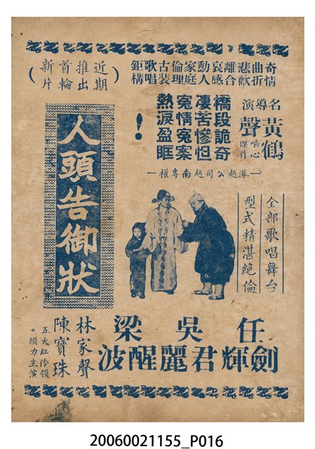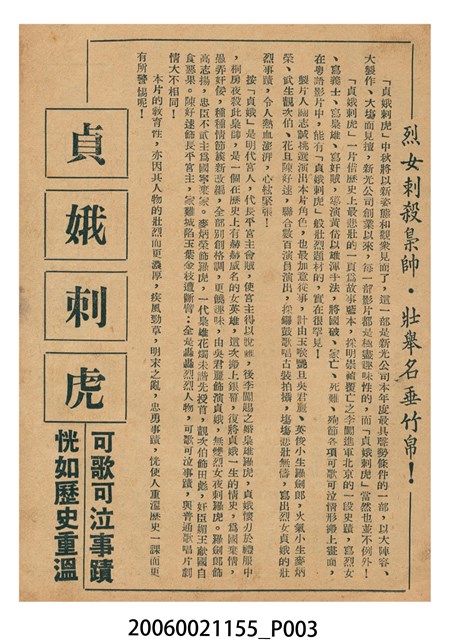 本件保存良好,彩色印刷,為費貞娥刺虎電影本事。由吳君麗、麥炳榮、羅劍郎主演,導演黃岱。背面為電影人頭告御狀。