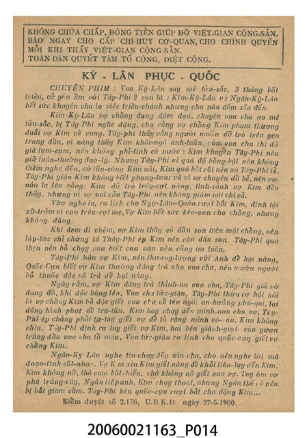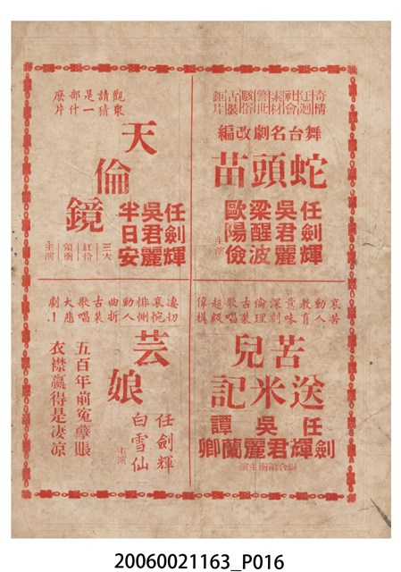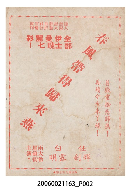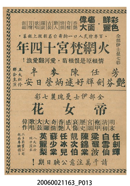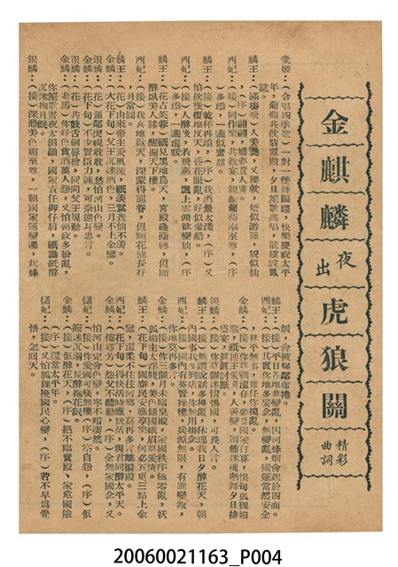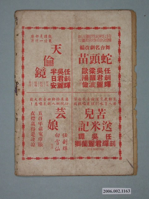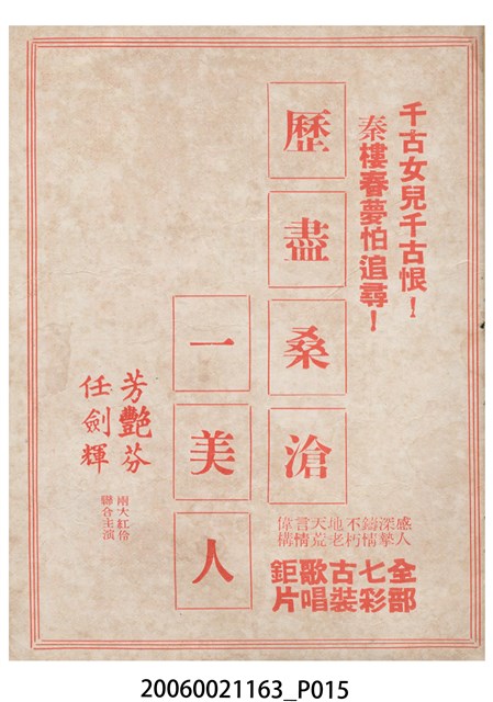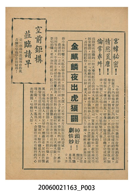 本件保存良好,彩色印刷,為金麒麟夜出虎狼関電影本事。背面為電影蛇頭苗、天倫鏡、苦兒送米記、芸娘。