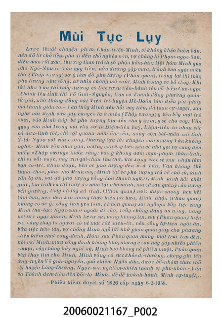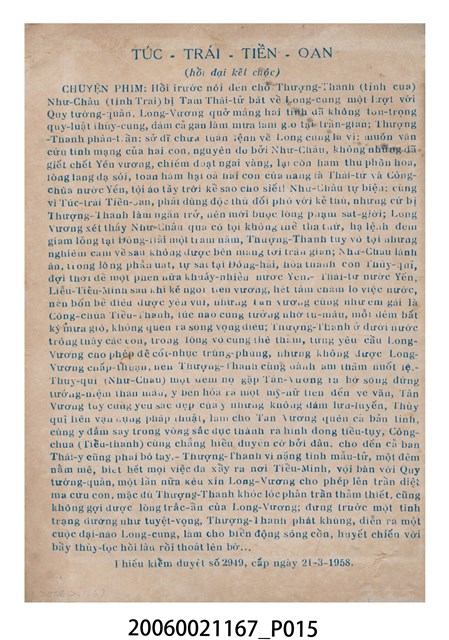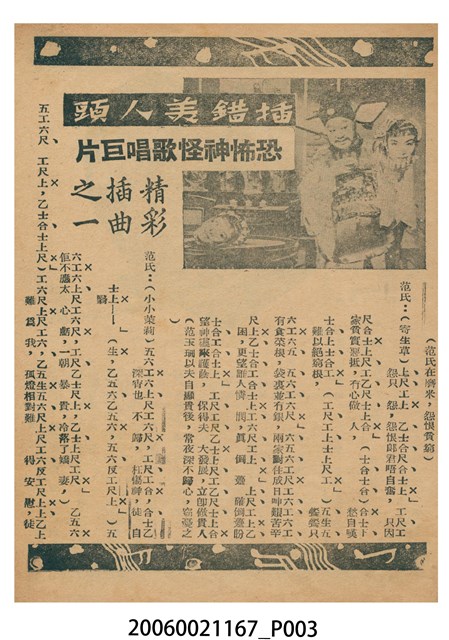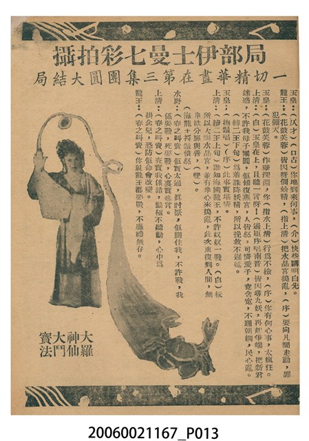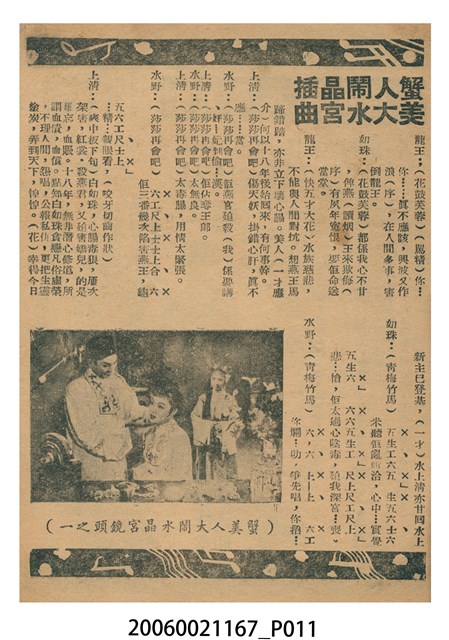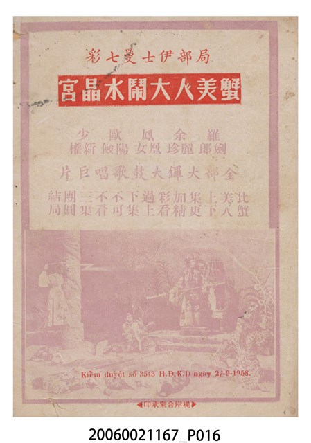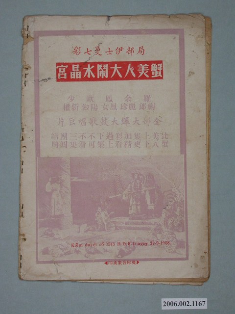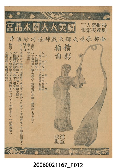 本件保存良好,單色印刷,為插錯美人頭電影本事。由鄧碧雲、羅劍郎、梁醒波、半日安、劉克宣主演,導演陸邦。背面為電影蟹美人大鬧水晶宮。