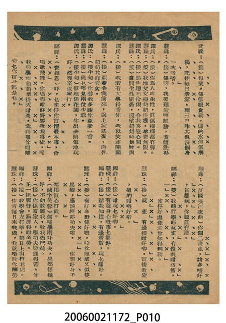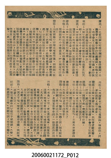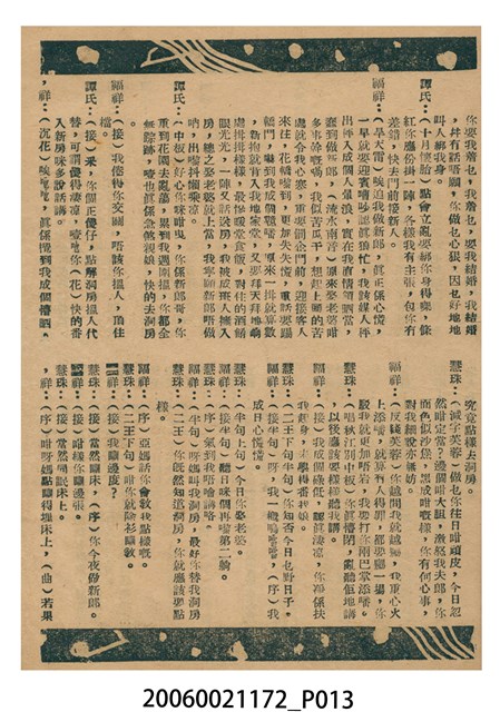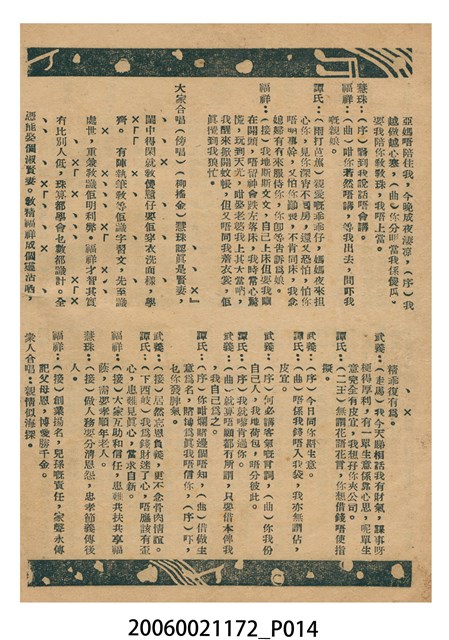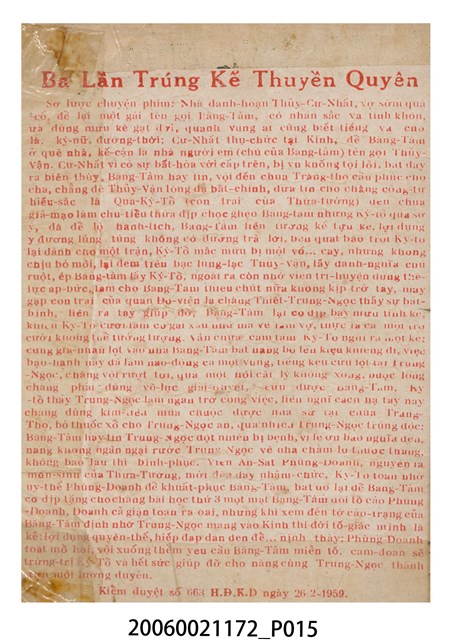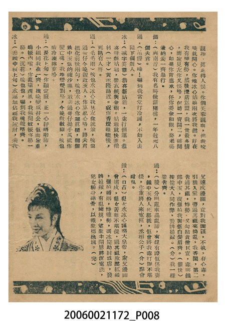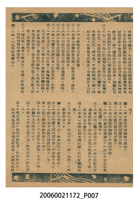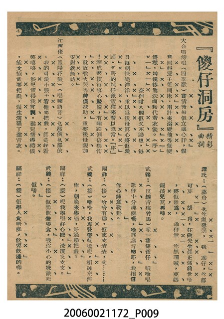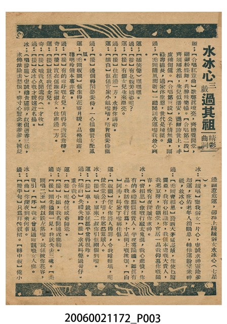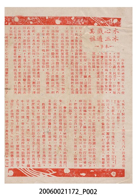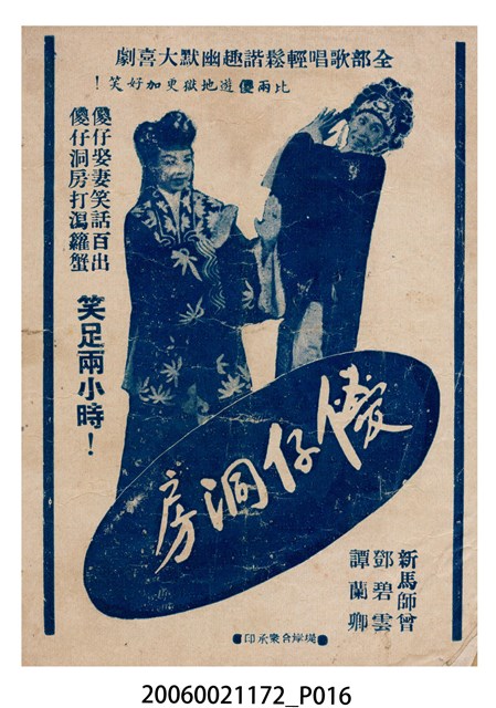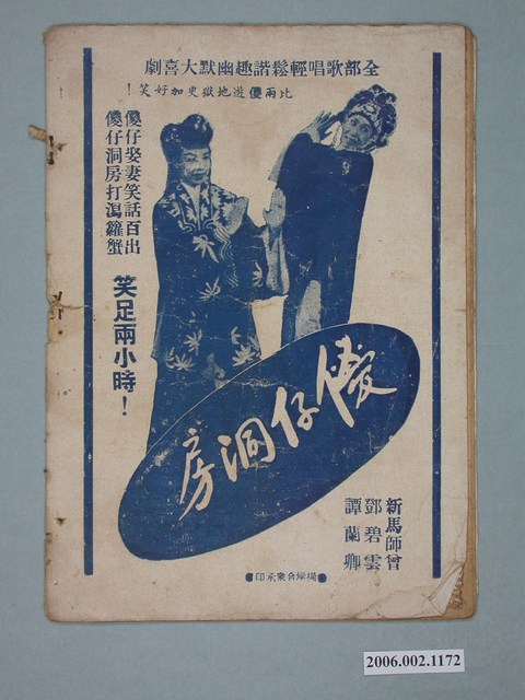 電影本事《水冰心三戲過其祖》封面直幅彩色印刷,外觀保存良好。電影講述過其祖在寺院輕薄水冰心,繼而逼迫水冰心下嫁的故事,由新馬師曾、鄧碧雲主演,導演陳皮,香港電影。封底為電影《傻仔洞房》,直幅藍色印刷,電影由新馬師曾、鄧碧雲主演的喜劇。下方有「堤岸合眾承印」字樣。