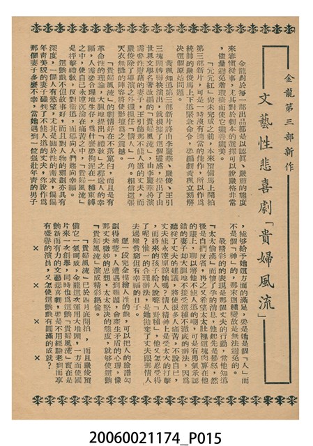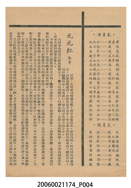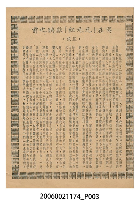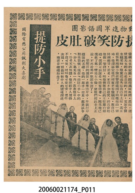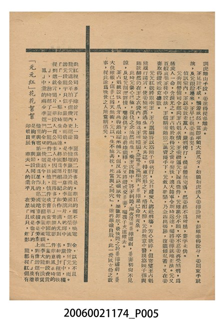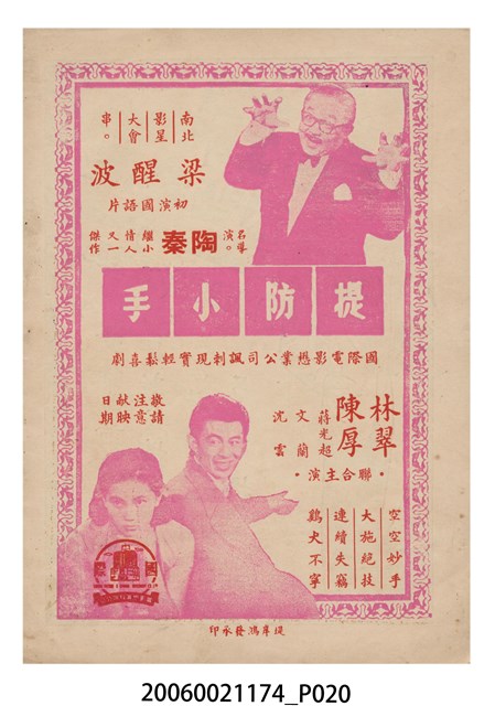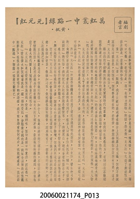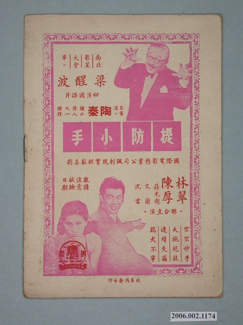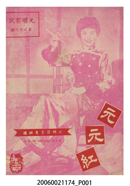 電影本事《元元紅》封面直幅雙色印刷,外觀保存良好,電影由李麗華、嚴俊主演,導演嚴俊,香港光明影業出品。左上方印有「光明影訊第63期」字樣。封底為電影《提防小手》1958年上映,直幅雙色印刷,國際戲院印製。電影由梁醒波、林翠主演,導演陶秦,香港電影。