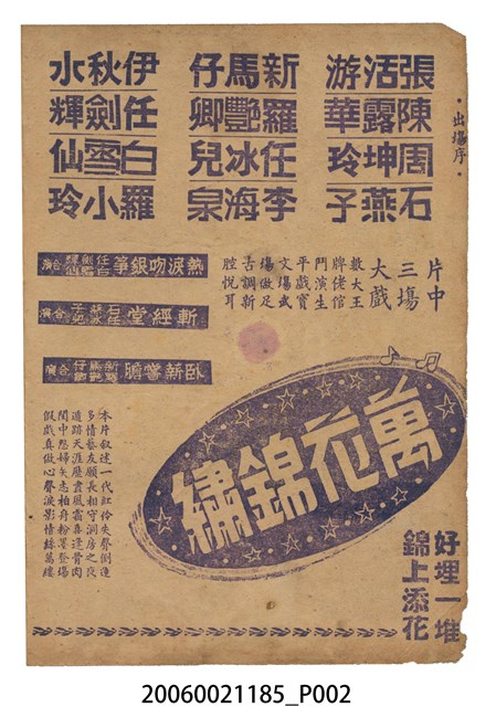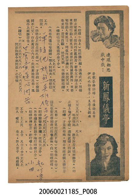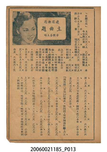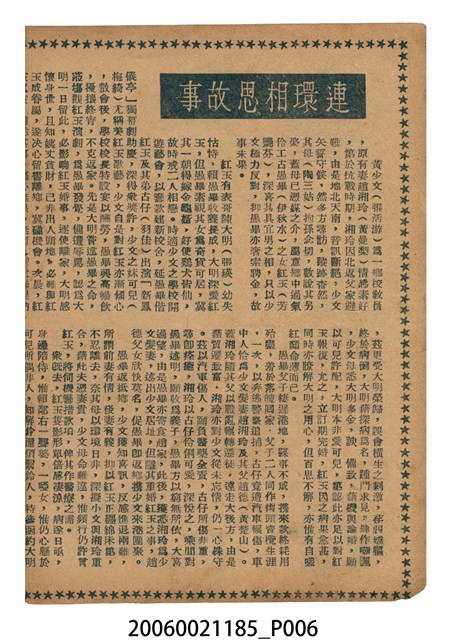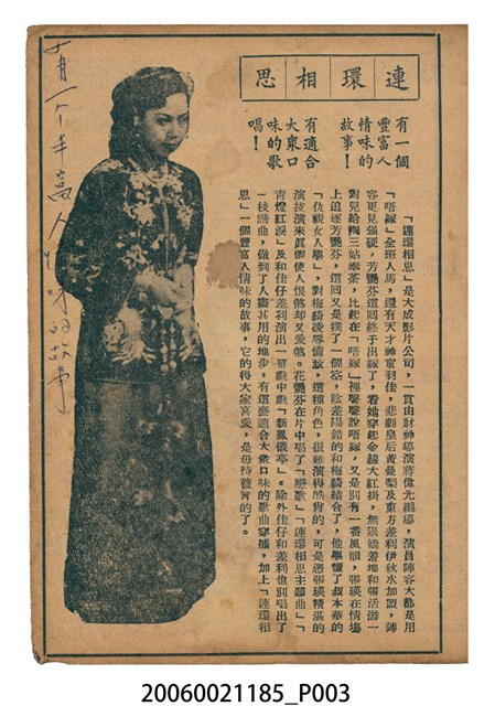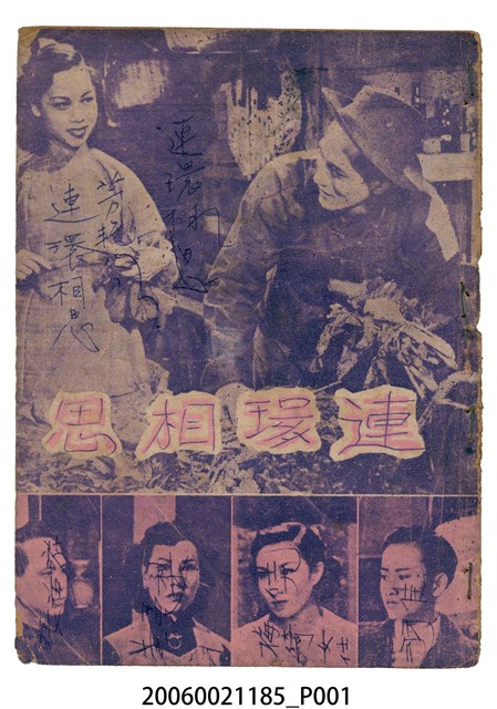 電影本事《連環相思》封面直幅彩色印刷,外觀保存良好。電影由芳艷芬、張活遊主演,導演蔣偉光,香港電影。有藍色手寫「連環相思、芳艷芬」等筆記。封底為直幅空白頁,有藍色手寫「金剛、為人父母、鄧兆祥」等筆記。