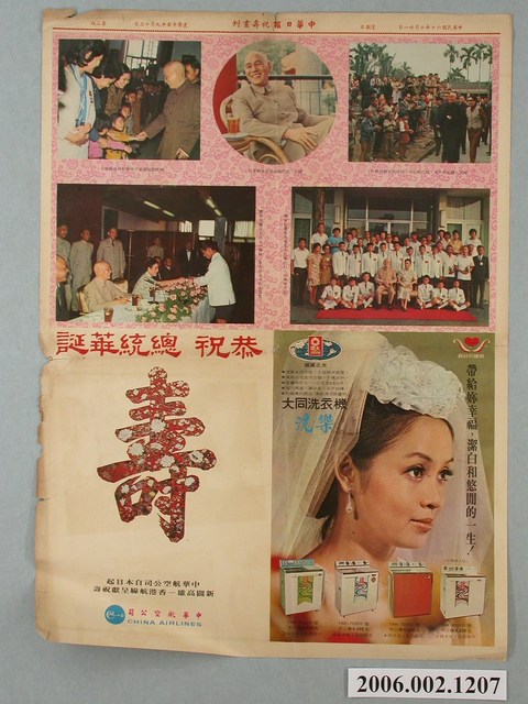 此物件為單張報紙,是1971年10月31日出版的《中華日報》祝壽畫刊第1、2版,主標題為「恭祝 總統八秩晉五華誕」,刊載多幅以蔣中正為主角之相片,並附有「總統萬歲 全民愛戴 莊敬自強 光復大陸」字樣。 蔣中正的形象在臺灣以各種方式塑造起來,如建立人像、於重要場域懸掛照片、加入課程教育、創作歌曲、道路命名甚至於制定節日,並且讓蔣中正、蔣經國統領的國民黨政府鞏固統治。對此民間也發出反對的聲音,如雷震創立的《自由中國》於1956年10月31日出版的「祝壽專號」發出社論認為「蔣公」應該卸下大任,設立繼任人才的選拔方式以及內閣制的確立,應作「無智、無能、無為」的元首,而在雷震的私人日記中則有對「蔣公華誕」這樣領袖崇拜的行為進行批判。(周俊宇。2008。467-471)。 《中華日報》是中國國民黨中央宣傳部於1946年創辦之報刊,為中華民國政府接管臺灣後所新設的第二間報社(首間為臺灣行政長官公署經營的《臺灣新生報》)。《中華日報》原為臺南地方報紙,1948年增設北部版,其臺南總社一度座落於日治時期勤業銀行臺南支店原址(建物已於1981年拆除)。2005年立法院「黨政軍退出媒體」決議後,中國國民黨陸續出脫旗下包括中影、中廣、中視、中華日報、中央日報之「五中黨產」,而後《中華日報》憑其在臺南地方的經營基礎,以獨立資金之狀態運作至今。
