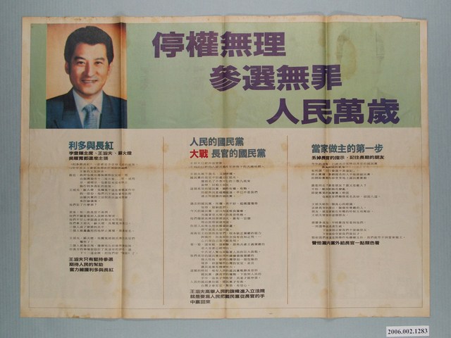 此物件為選舉文宣,標題為「停權無理 參選無罪 人民萬歲」,為王滔夫競選廣告。 本件所提及的候選人王滔夫,為新國民黨連線成員,曾任臺南市議員、立法委員。此份宣傳單為其在1995年以無黨籍身份參選立法委員時所印製,王滔夫在此次的選舉中涉及賄選,後續有千餘名助選員遭起訴。 臺灣的立法委員選舉始於1948年,尚領有部分中國領土的中華民國政府以全國各省、直轄市,以及邊疆民族、僑民、職業團體為範疇舉行選舉。1949年中央政府遷臺,自中國大陸各省隨附來台的立法委員,依「司法院大法官會議釋字第31號解釋」得以無限期延任。1969年,中華民國政府發佈《動員戡亂時期自由地區中央公職人員增選補選辦法》展開立法委員的增補選,此後每屆選舉之競爭益加激烈,甚至於1977年爆發「中壢事件」。最後,經歷1991年的憲法增修,政府得以正式展開「中央民意代表全面改選」,並於1992年舉辦了第二屆立法委員選舉。