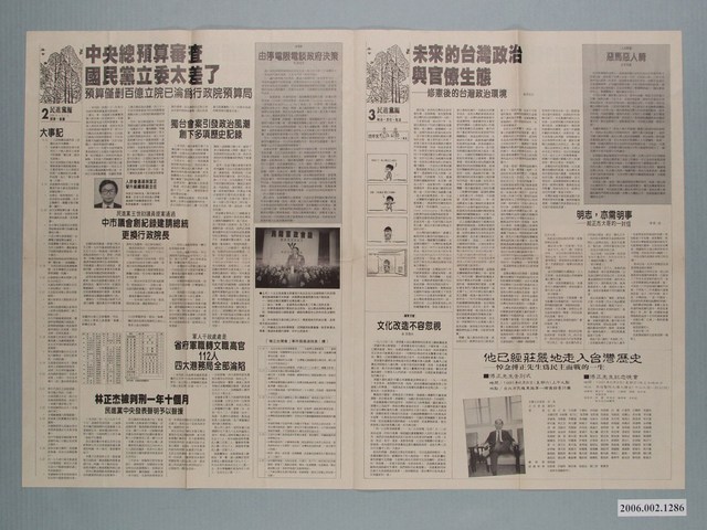 此物件為1991年6月1日出版的《民進黨報》第69期。內容要目計有〈毫無意義的內閣搬風 責任政治沒有確立 對郝內閣更加失望〉、〈五二○示威遊行有共識 齊聲要求:郝柏村下台!! 民進黨強力文宣質疑郝柏村〉、〈為臺灣民主奉獻一生的民主鬪士――悼念傅正先生〉、〈讓政治迫害不再發生 讓白色恐怖永遠消失 民進黨中央針對劉宜良案發表聲明〉、〈民進黨財務規則修改 以健全黨務運作〉、〈民進黨中常會通過修訂黨員入黨辦法〉、〈廢除蒙藏委員會成立原住民族委員會 民進黨中常會籲黨員參加〉、〈謝謝大家的愛顧 請繼續支持 民進黨報擴大發行贈獎活動已公開開獎 一獎未賣出將保留七月底再多開一獎〉、〈修訂縣市黨部組織規程 明訂縣市黨部主委與評委召集人出缺處理辦法〉、〈淺談全代會議事規則〉、〈協助解決地方黨部困境 是民進黨旁無責貸的責任與考驗〉、〈汐止文化之鎮〉。 此件為民進黨的機關刊物《民進黨報》,為1988年創辦的《民進報》周刊的接續刊物,為民主進步黨的機關刊物,前身為1987年2月開始發行的《民進報》,總主筆為新潮流派系元老、素有「臺獨理論大師」之稱的林濁水。《民進報》之創辦,是民主進步黨繼1986年成功突破黨禁限制而創立後,另一次對於戒嚴體制--報禁的挑戰,由於報禁之限制,此時臺灣社會僅有黨報、官報、軍報流通,民間辦報甚為困難。《民進報》於1988年由報紙轉型為雜誌,其內容主要為時政評論、介紹民進黨相關事務以及社會運動宣傳。
