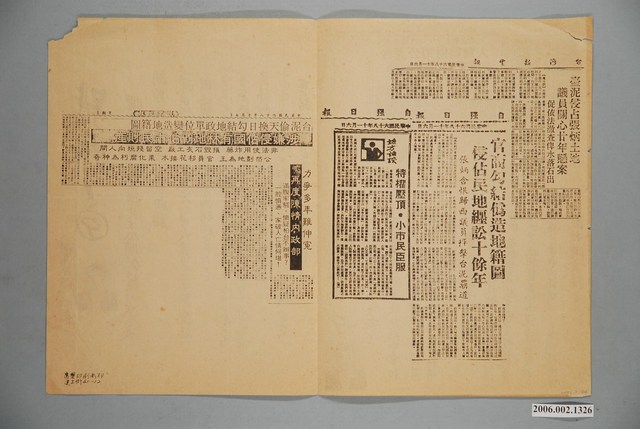 此物件為宣傳單,為單張雙面黑白印刷品,內容為剪報縮圖、手寫文宣及陳光復照片。正面標題為「號外!黨外獨眼龍∕9」,所刊剪報標題分別為〈官商勾結偽造文書霸佔土地――臺泥公司財勢驚人 纏訟十餘載未解決 近倡端正政風受害者求翻案〉、〈臺泥侵佔張炳土地 議員關心廿年懸案 促依法澈查俾水落石出〉、〈官商勾結偽造地籍圖 侵佔民地纏訟十餘年――張炳含恨歸西 議員抨擊臺泥霸道〉、〈特權壓頂•小市民臣服〉、〈台泥偷天換日勾結地政單位變造地籍圖 涉嫌侵佔國有林地霸佔市民財產 非法使用炸藥 摧毀石灰工廠 空留殘垣向人間 公然劃地為王 官員移花接木 果化腐朽為神奇〉等。剪報面的左下角,以手寫字跡留有承印廠商資料。 此物件即是1979年高雄市議員選舉的相關宣傳單。另此物件中提到的陳光復為澎湖人,為民主進步黨黨員,曾擔任立法委員以及高雄市議員,為高雄市政壇的人物之一,後轉為擔任澎湖縣縣長,幼年因受傷而導致左眼失明,故在從政早期自稱為「黨外獨眼龍」。而另外提到的陳田錨為高雄陳中和家族成員,為高雄的名門望族,陳田錨為國民黨黨員,並長期就任高雄市市議會議長,並隨後擔任總統府資政,為高雄政壇中的重要人物。