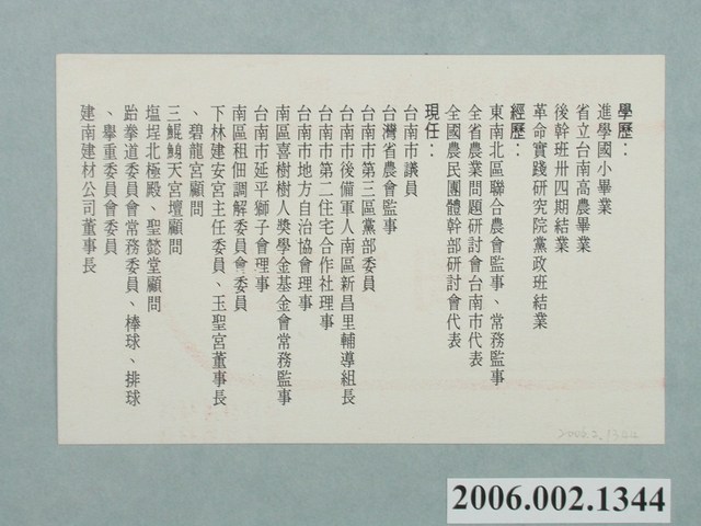 此為一選舉宣傳單,為周東吉的臺南市市議員競選宣傳單,此物件正面印有周東吉的照片,及註明為第一選區(東南區)的後選人,下方印有周東吉的聯絡地址與電話。背面則印有周東吉的學歷、經歷、現在職位。 此物件提到的周東吉,於革命實踐研究院黨政班研習並且結業,後擔任第8、9、10屆臺南市市議員,並且曾就任臺南鹽水區下林建安宮、玉聖宮、碧龍宮的相關職位。周東吉因其身材而在議會中有「矮阿冬瓜」之綽號,且與同樣曾擔任過臺南市議員的周明德為親兄弟。 臺灣的縣市議員選舉始於日治時代,在1935年6月臺灣總督府發佈《市會議員及街庄協議會員選舉規程》後,在該年的11月22日舉行全臺第一次地方民意代表選舉,此次選舉,選出的民意代表官選、民選各半,而選出來之議員僅具議決權,不具有提案、質詢等權責。後在國民黨政府派員接收臺灣後,1945年臺灣行政長官公署公布「臺灣省各級民意機關成立方案」,並於1946年辦理間接選舉產生縣市參議員。而在1950年,舉辦了第1屆民選的縣市議員選舉,臺灣民眾得以選出為自身權益喉舌的議員。